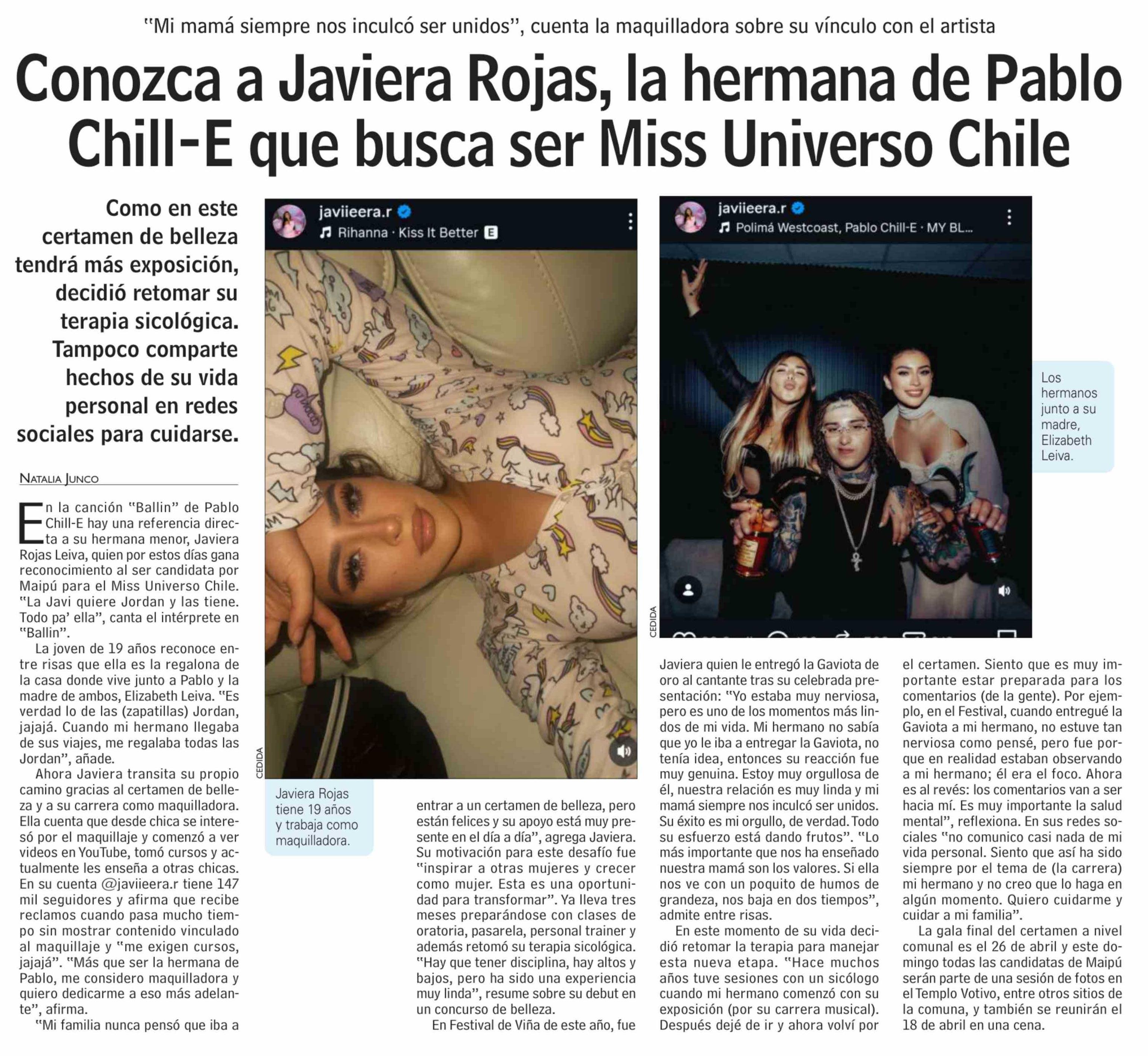 Conozca a Javiera Rojas, la hermana de Pablo Chill-E que busca ser Miss Universo Chile