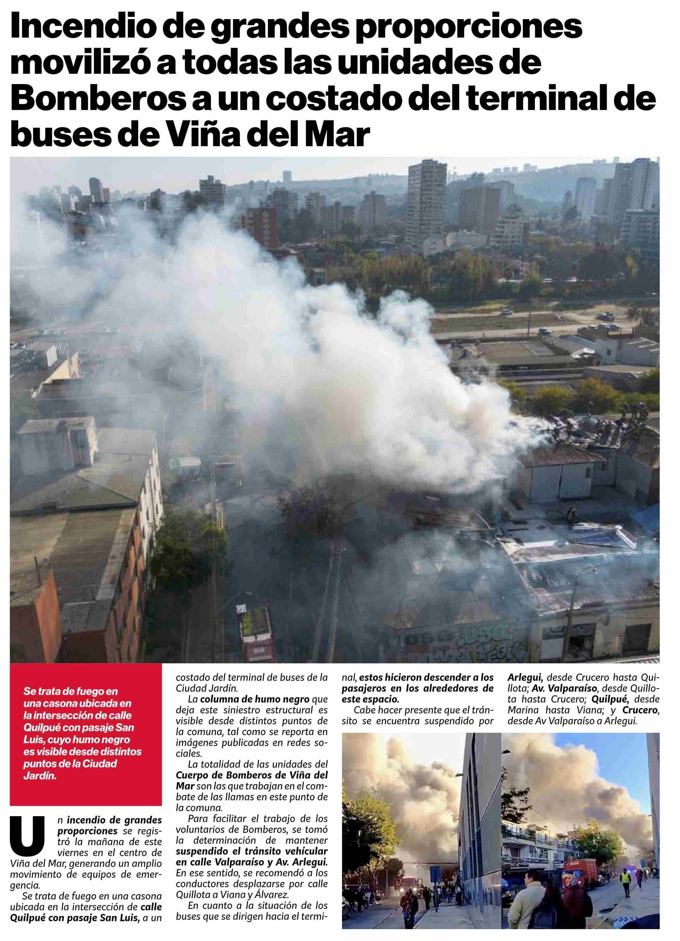 Incendio de grandes proporciones movilizó a todas las unidades de Bomberos a un costado del terminal de buses de Viña del Mar