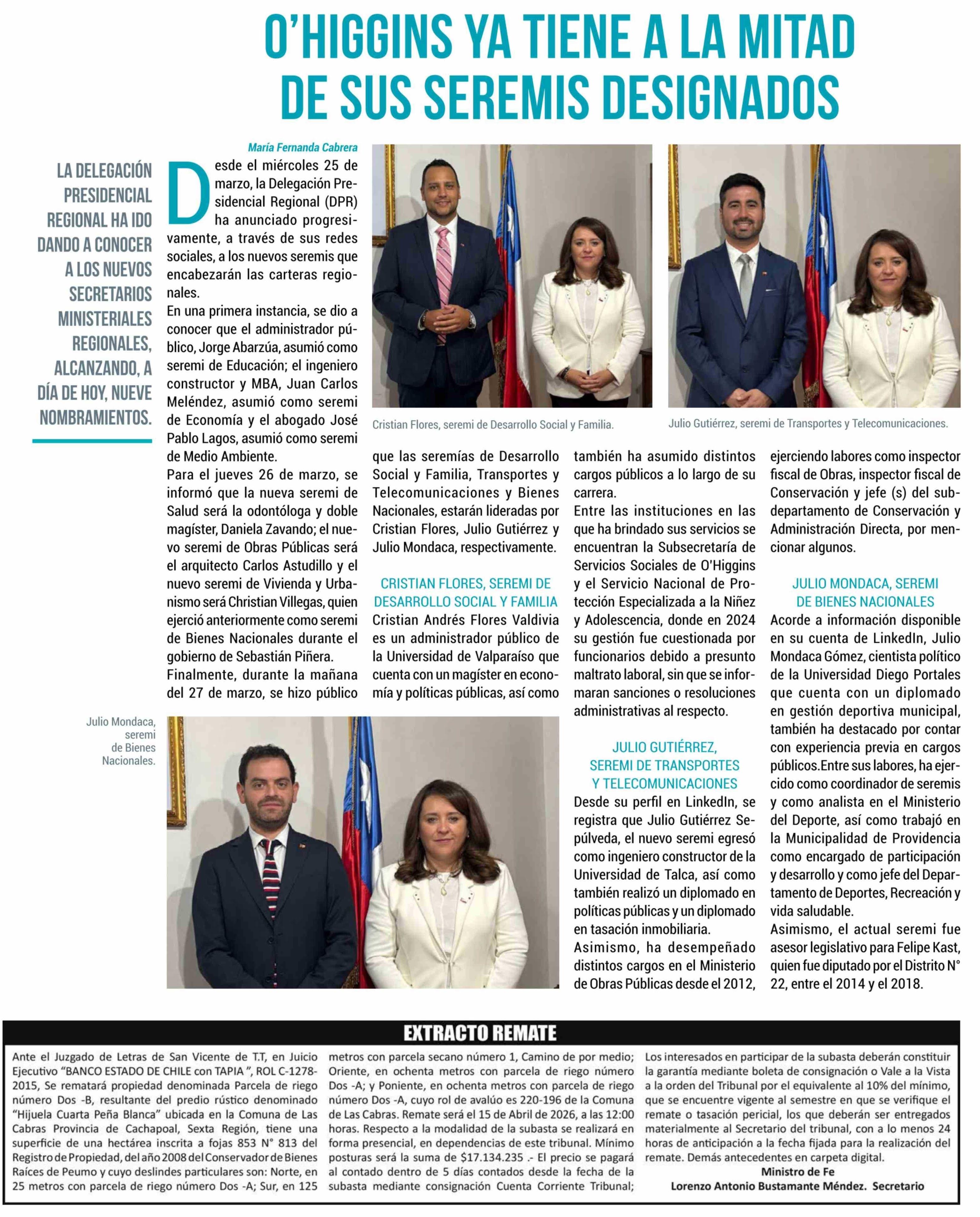O'HIGGINS YA TIENE ALA MITAD DE SUS SEREMIS DESIGNADOS
