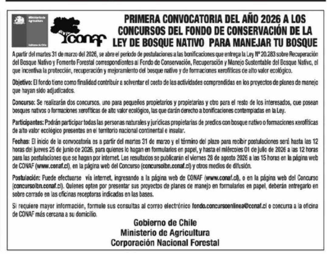 | Título: | Aviso Licitaciones: PRIMERA CONVOCATORIA DEL AÑO 2026 A LOS CONCURSOS DEL FONDO DE CONSERVACIÓN DE LA ICONA LEY DE BOSQUE NATIVO PARA MANEJAR TU BOSQUE |