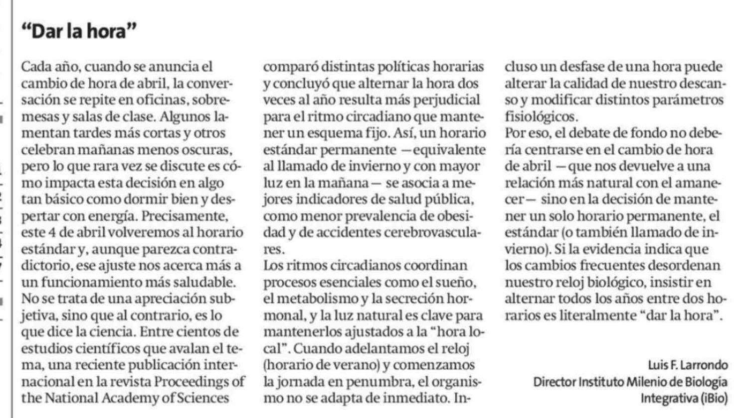 Título: Cartas: "Dar la hora" Cada año, cuando se anuncia el cambio de hora de abril, la conversación se repite en oficinas, sobremesas y salas de clase. Algunos lamentan tardes más cortas y otros celebran mañanas menos oscuras, pero lo que rara vez se discute es cómo impacta esta decisión en algo tan básic