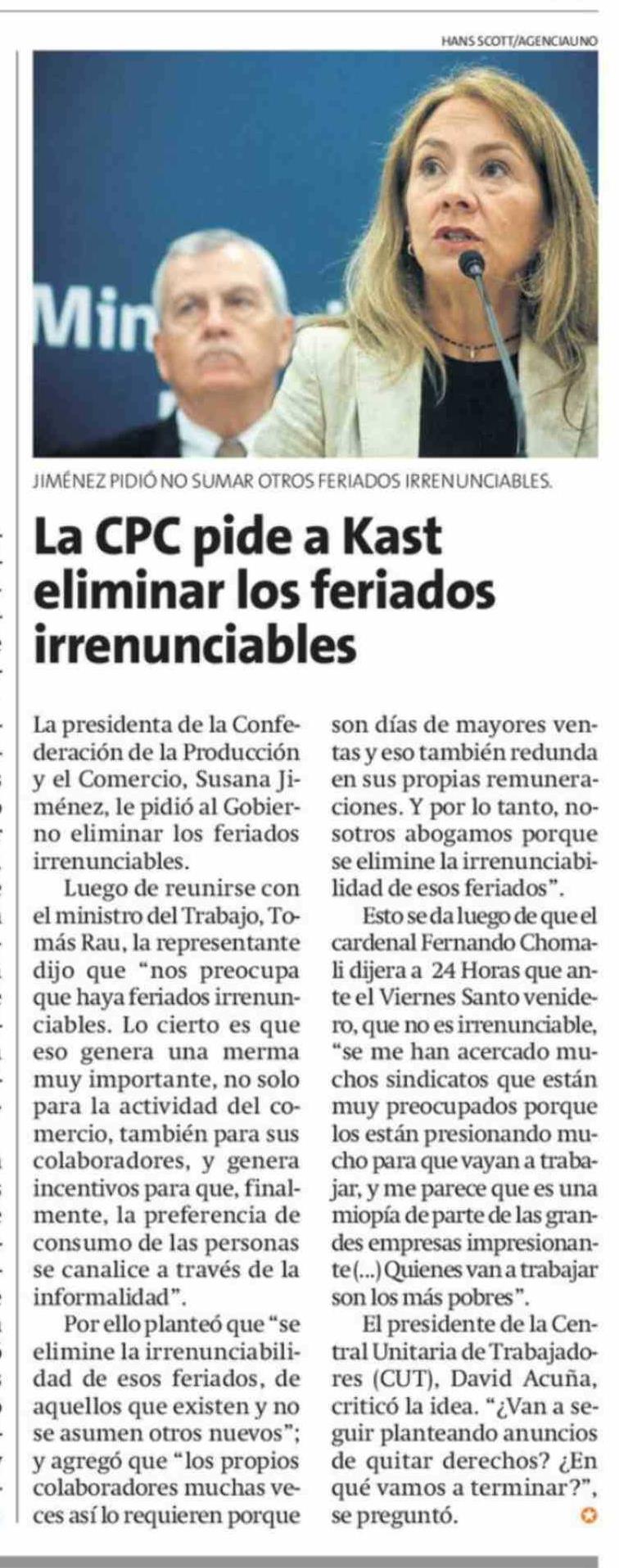 La CPC pide a Kast eliminar los feriados irrenunciables
