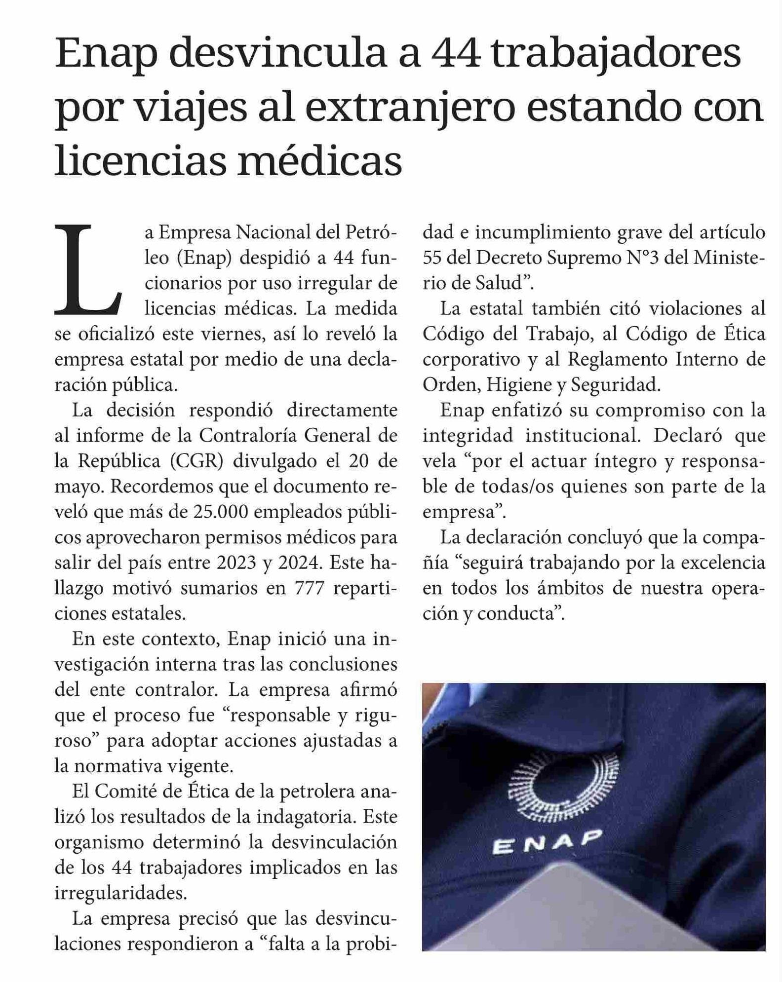 Enap desvincula a 44 trabajadores por viajes al extranjero estando con licencias médicas
