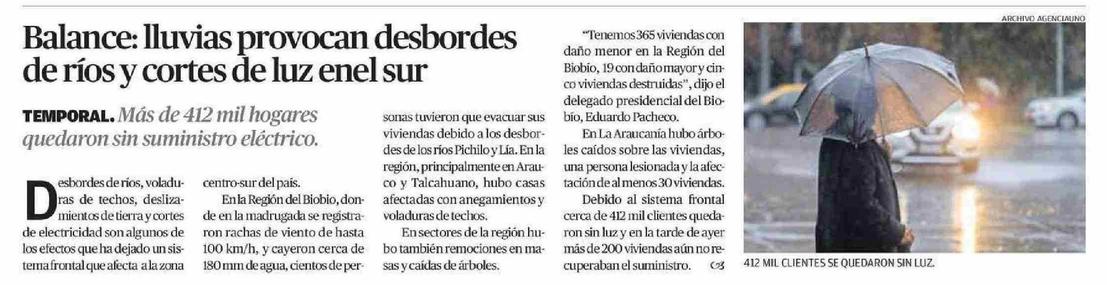 Balance: lluvias provocan desbordes de ríos y cortes de luz enel sur