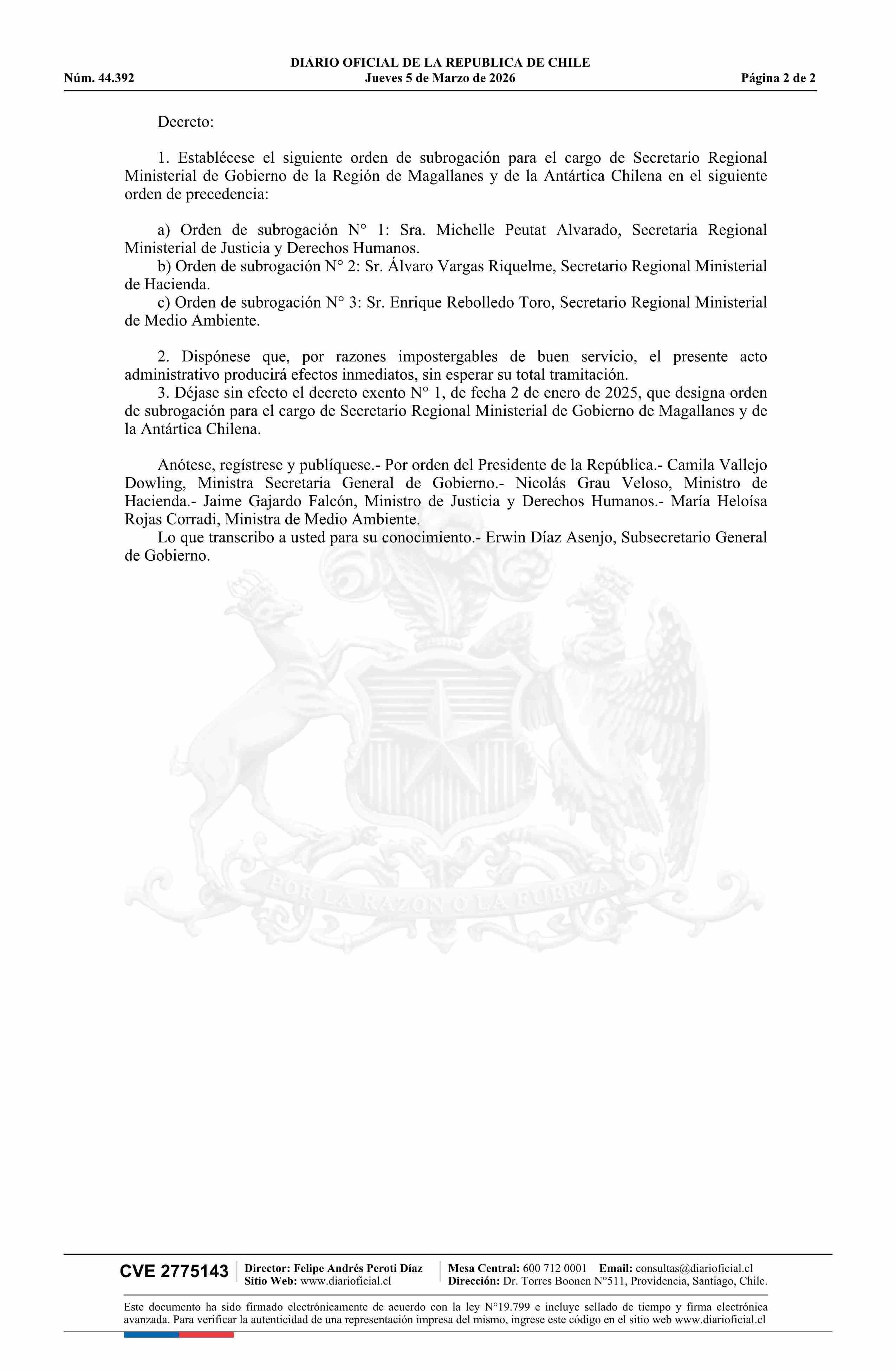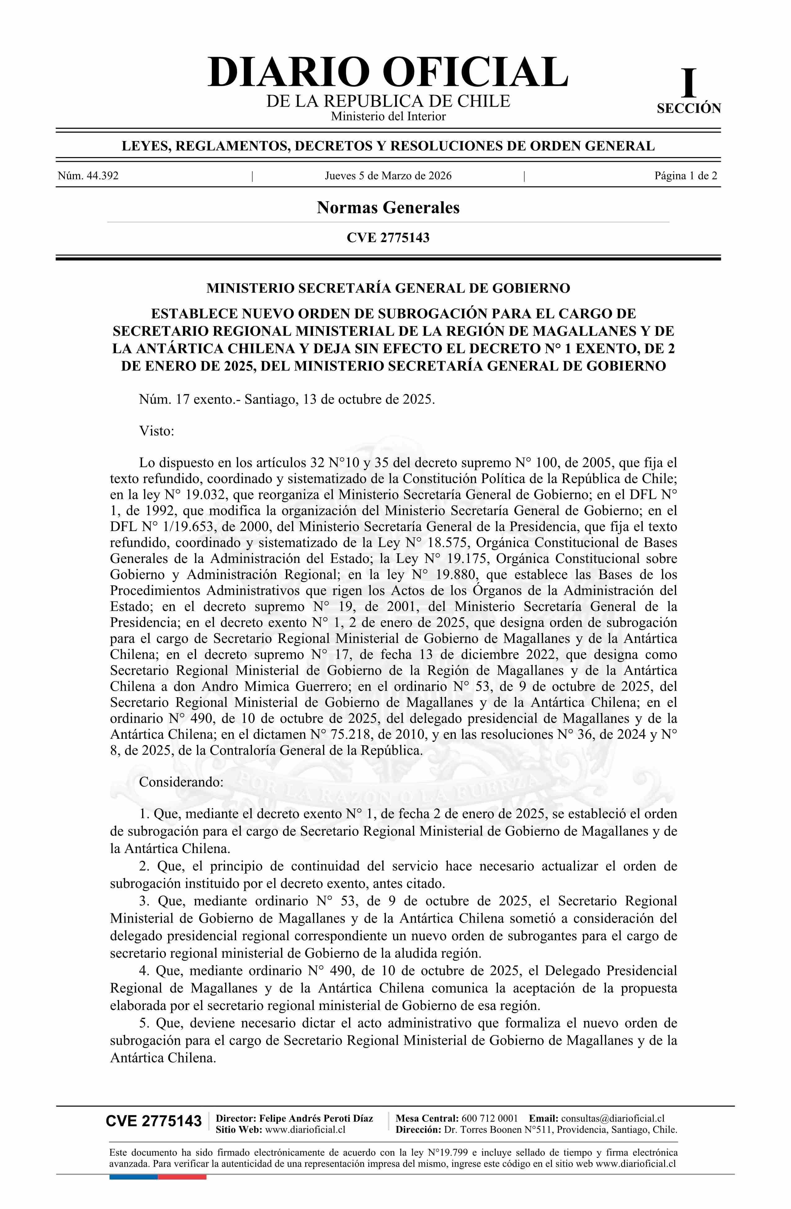 Título: Decreto exento número 17, de 2025.- Establece nuevo orden de subrogación para el cargo de Secretario Regional Ministerial de la Región de Magallanes y de la Antártica Chilena y deja sin efecto el decreto N° 1 exento, de 2025