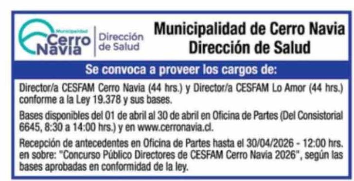 | Título: | Extractos: Municipalidad de Cerro Navia Dirección de Salud Municipalidad Cerro Navia Dirección de Salud Se convoca a proveer los cargos de: Director/a CESFAM Cerro Navia (44 hrs.) y Director/a CESFAM Lo Amor (44 hrs.) conforme a la Ley 19.378 y sus bases. Bases disponibles del 01 de abril al 30 de a |