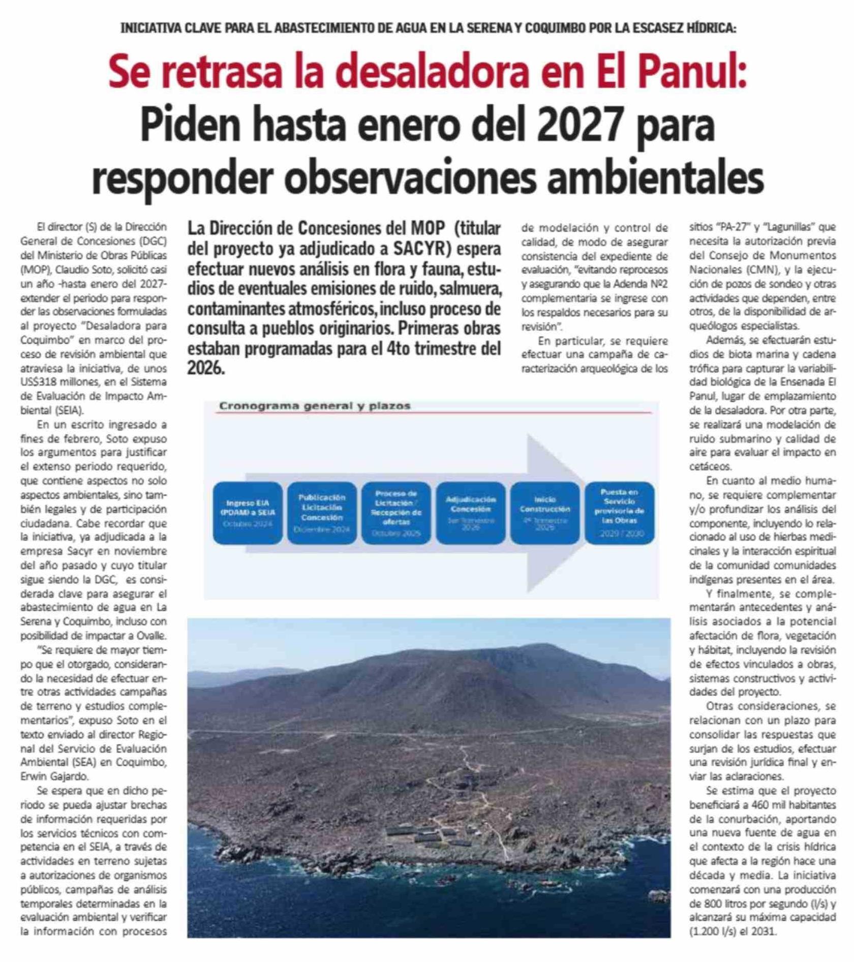 Se retrasa la desaladora en El Panul: Piden hasta enero del 2027 para responder observaciones ambientales