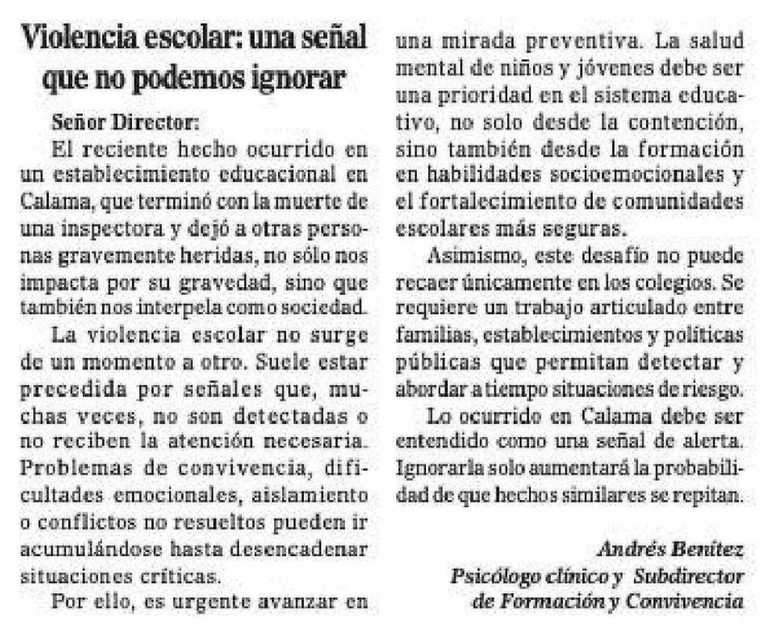 Cartas: Violencia escolar: una señal que no podemos ignorar