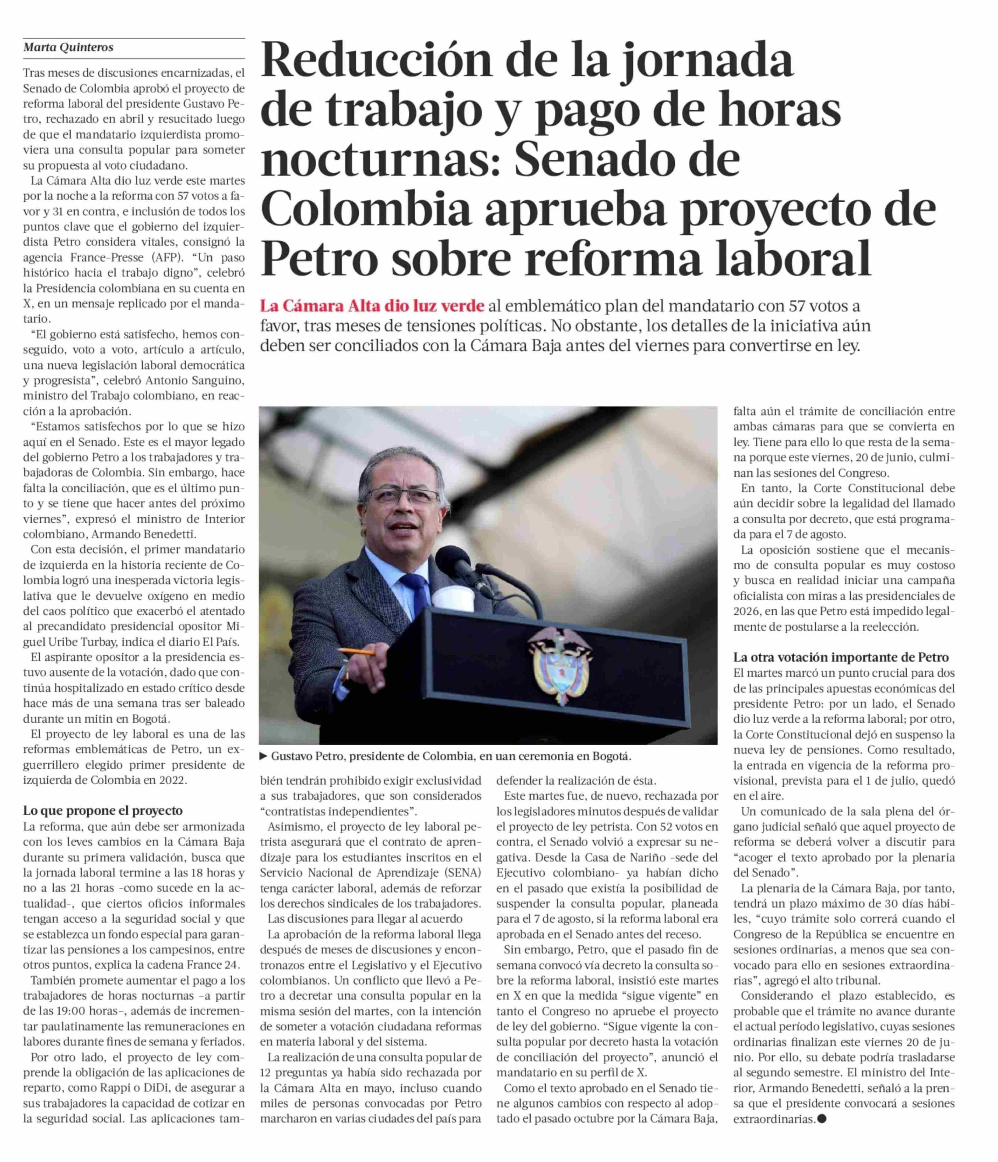 Reducción de la jornada de trabajo y pago de horas nocturnas: Senado de Colombia aprueba proyecto de Petro sobre reforma laboral