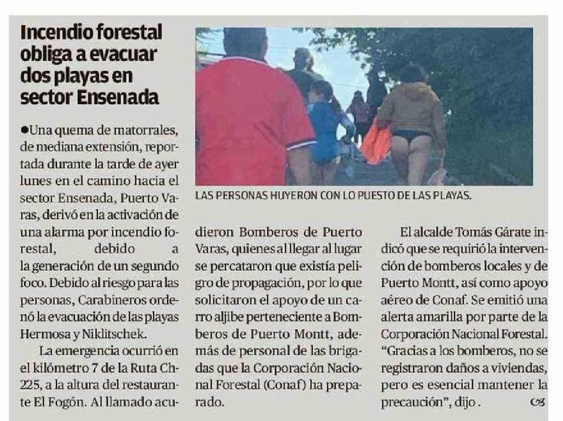 Incendio forestal obliga a evacuar sector Ensenada dos playas en