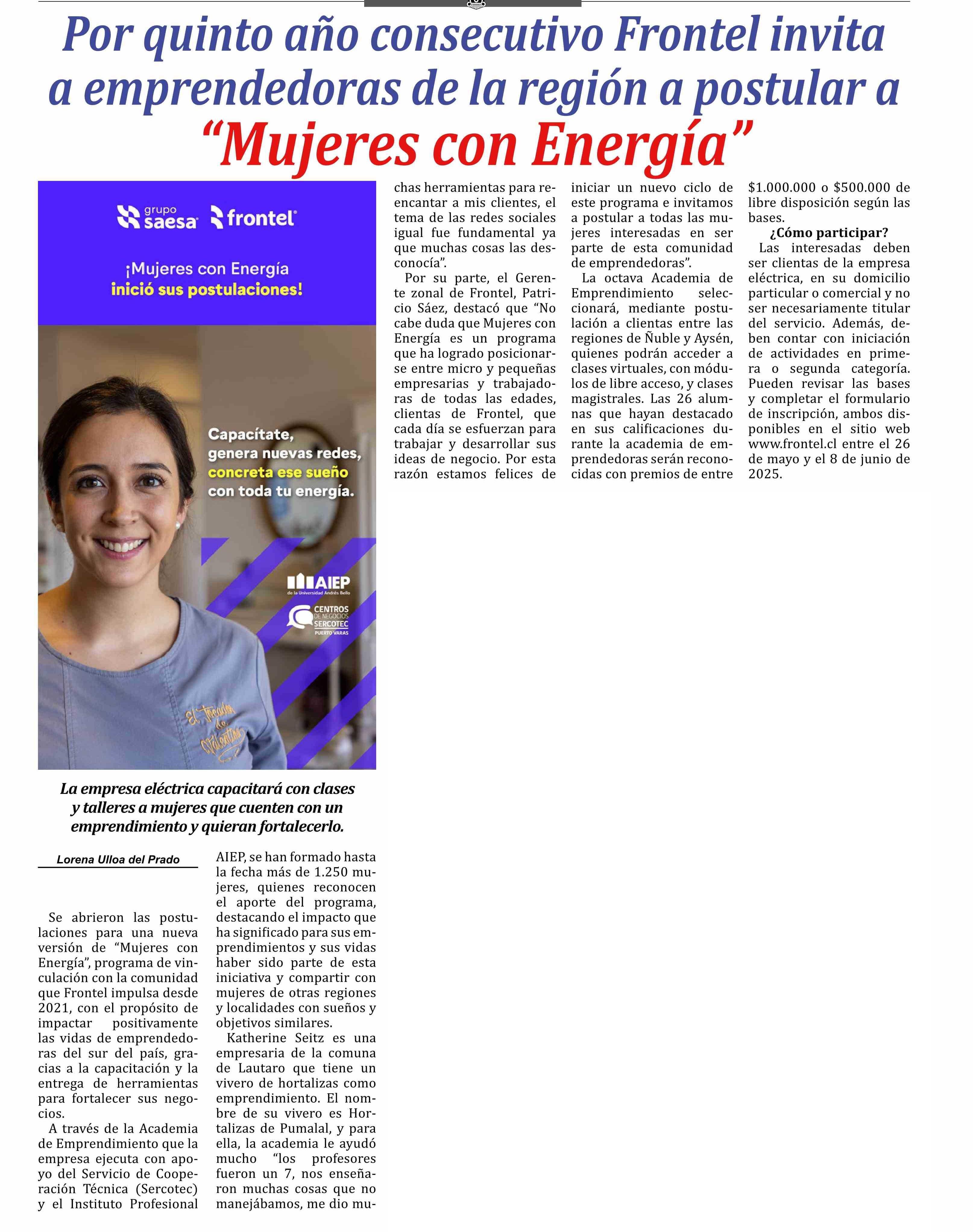 Por quinto año consecutivo Frontel invita a emprendedoras de la región a postular a “Mujeres con Energía”