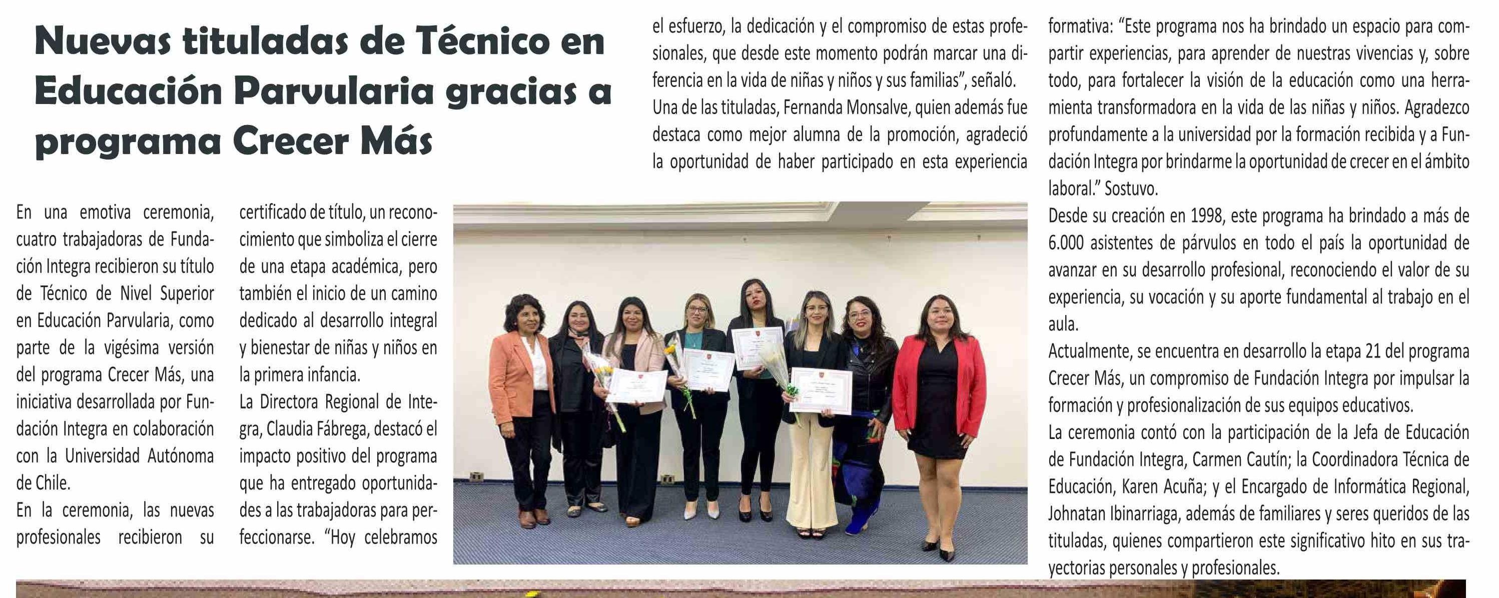 Nuevas tituladas de Técnico en Educación Parvularia gracias a programa Crecer Más