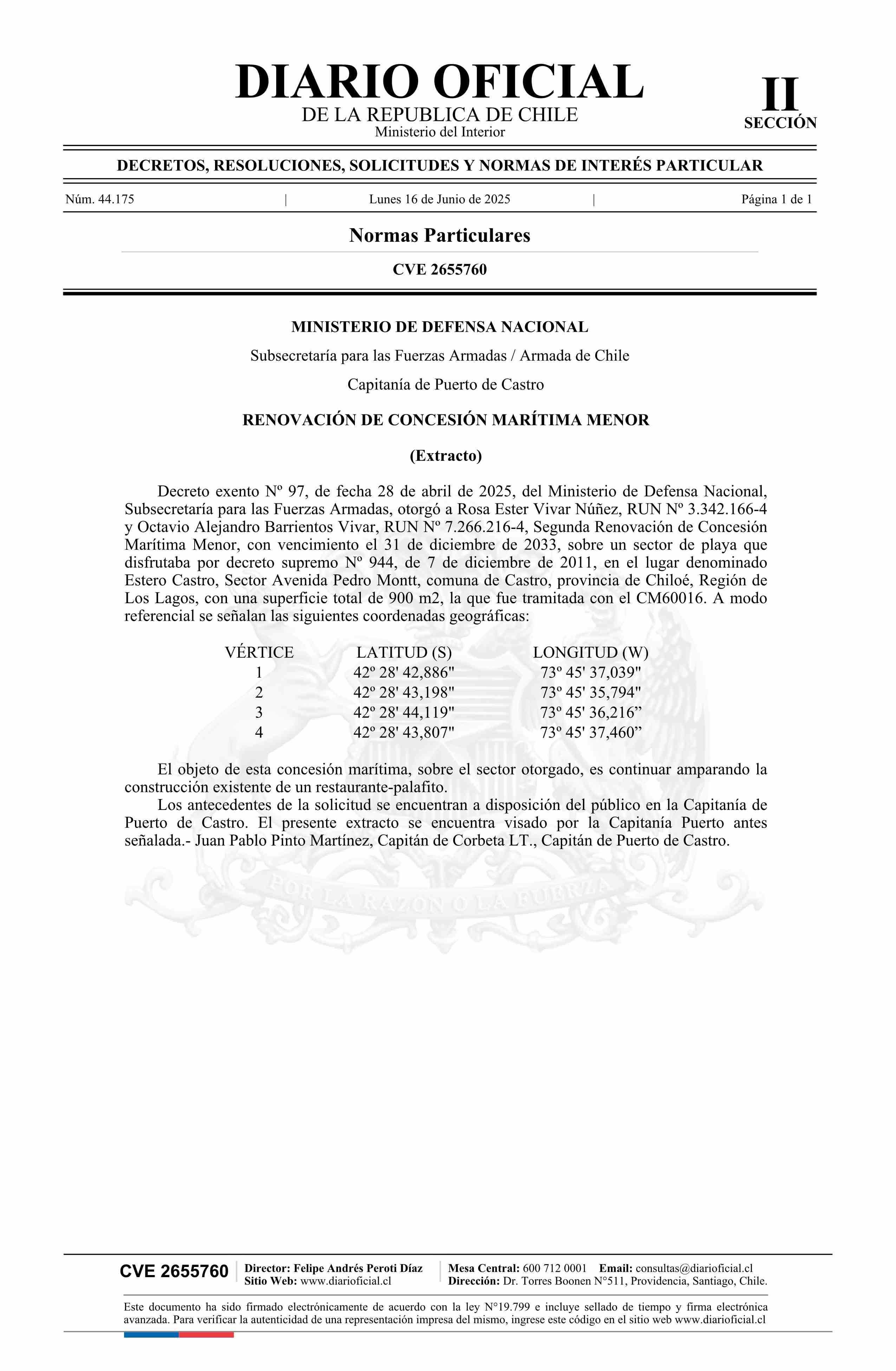 | Título: | Extracto de decreto exento número 97, de 2025.- Renovación de concesión marítima menor |