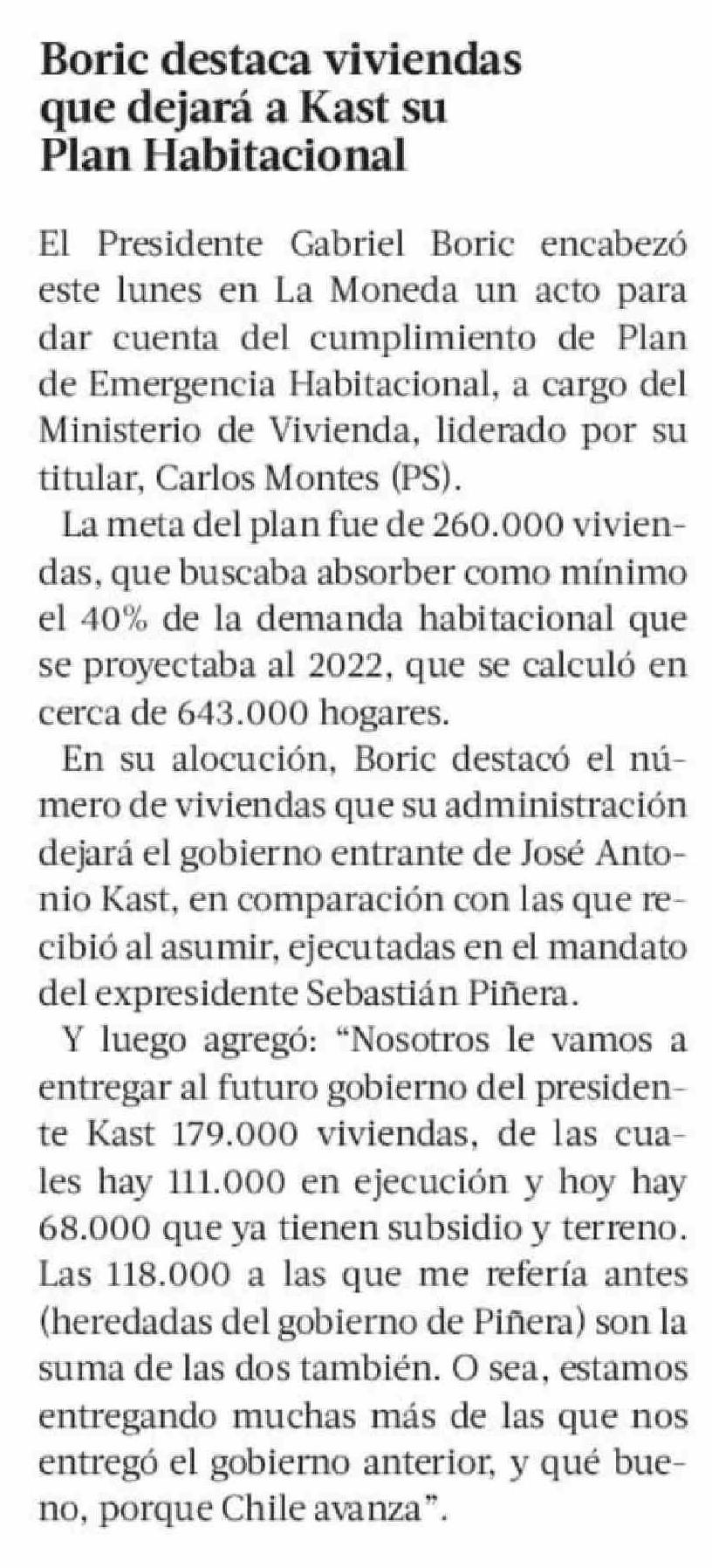 Boric destaca viviendas que dejará a Kast su Plan Habitacional