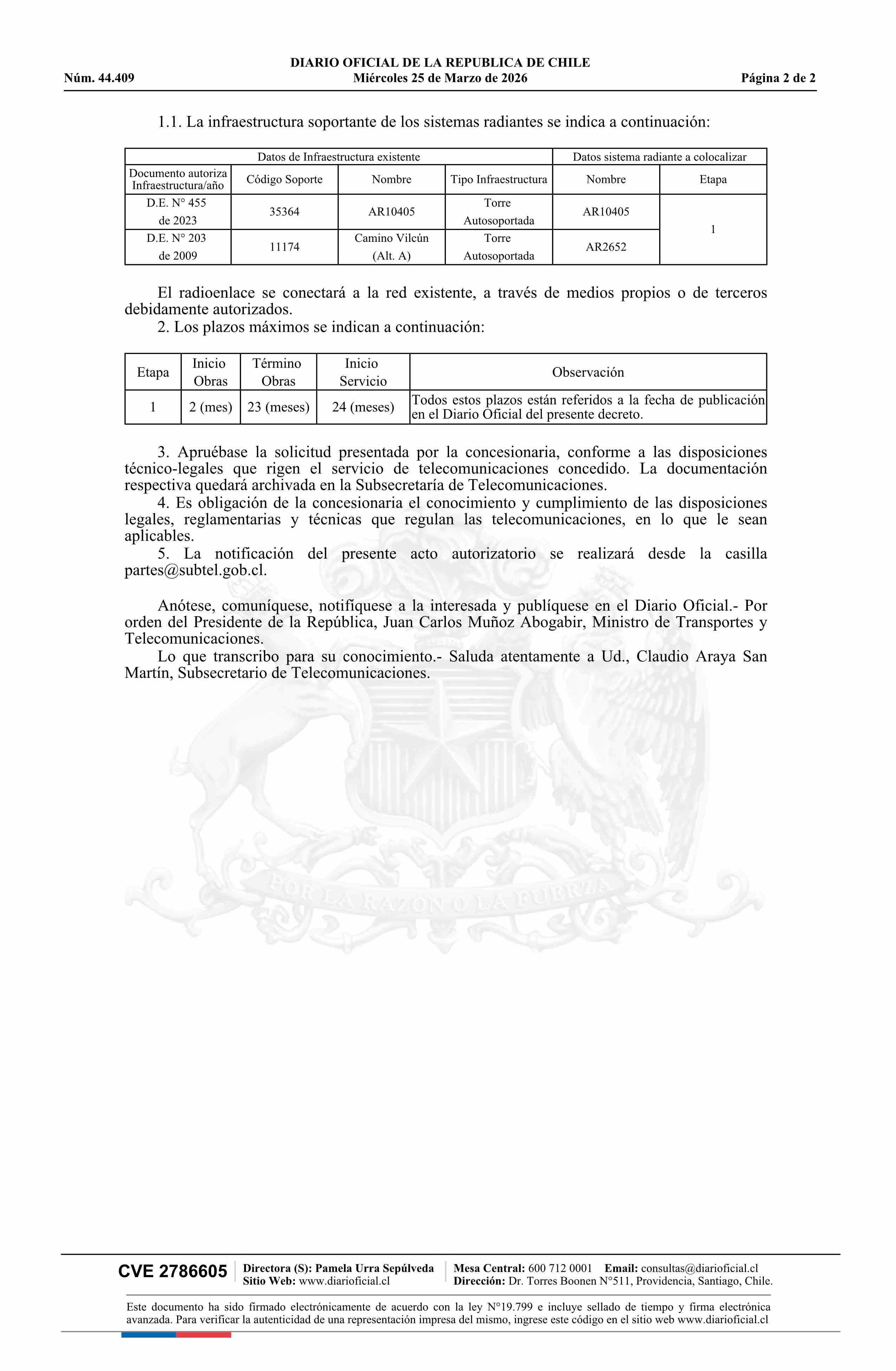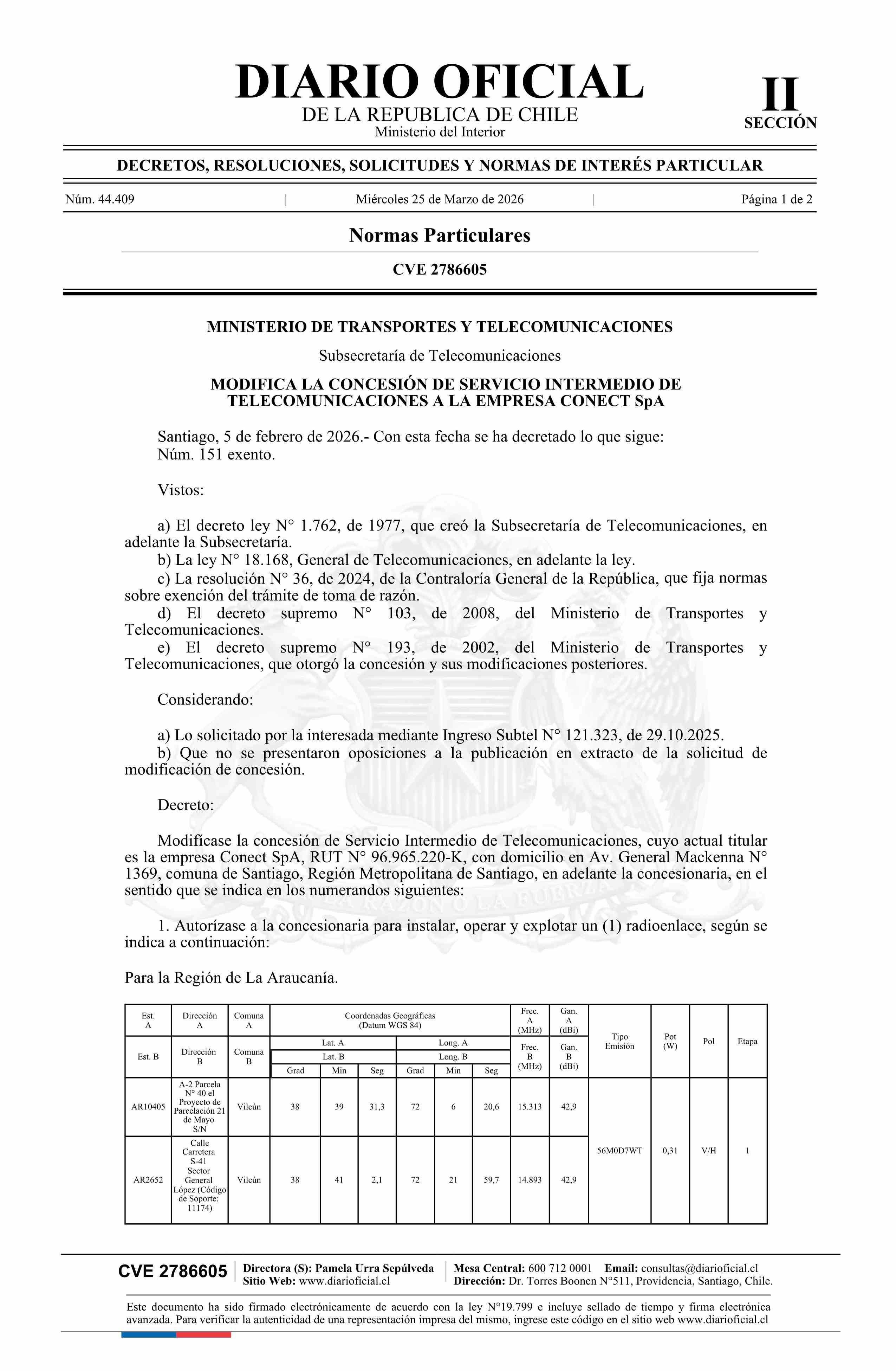 | Título: | Decreto exento número 151, de 2026.- Modifica concesión de servicio intermedio de telecomunicaciones a la empresa Conect SpA |