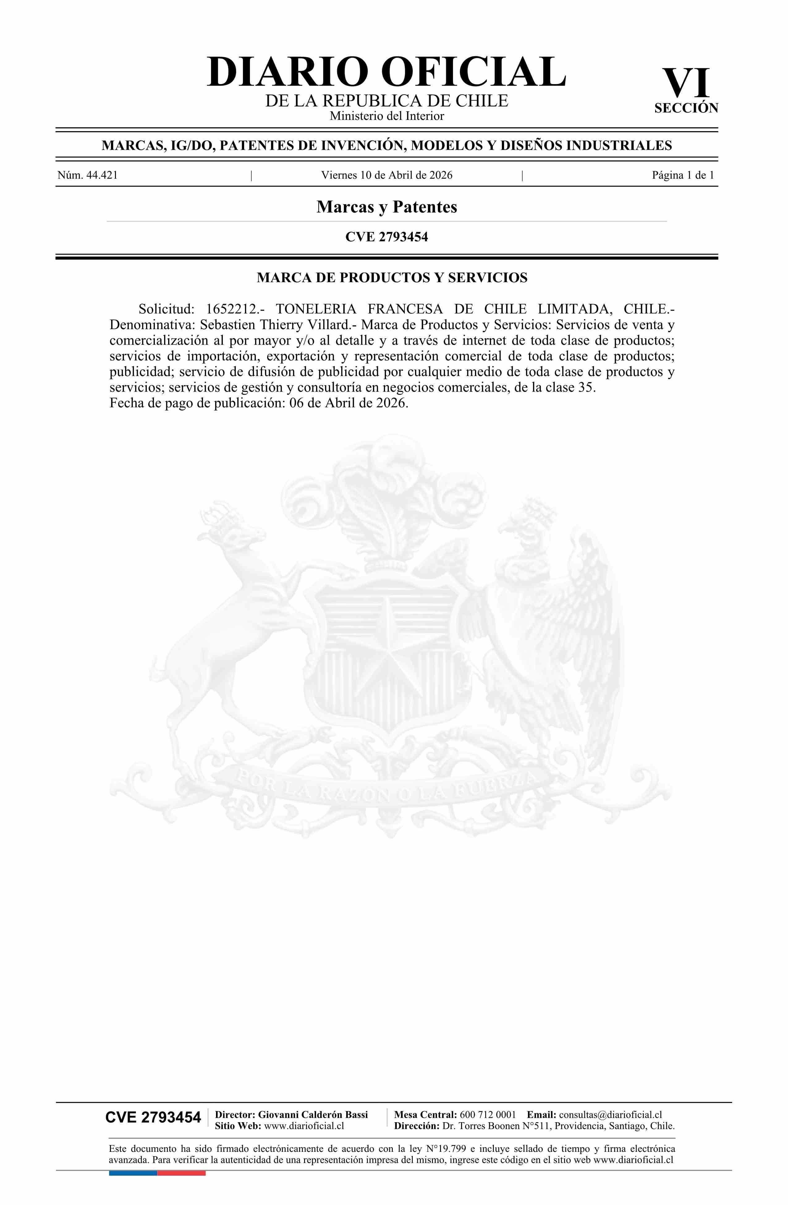 Diario Oficial Edición Electrónica (Diario Oficial de Chile - 6 Marcas Y Patentes)