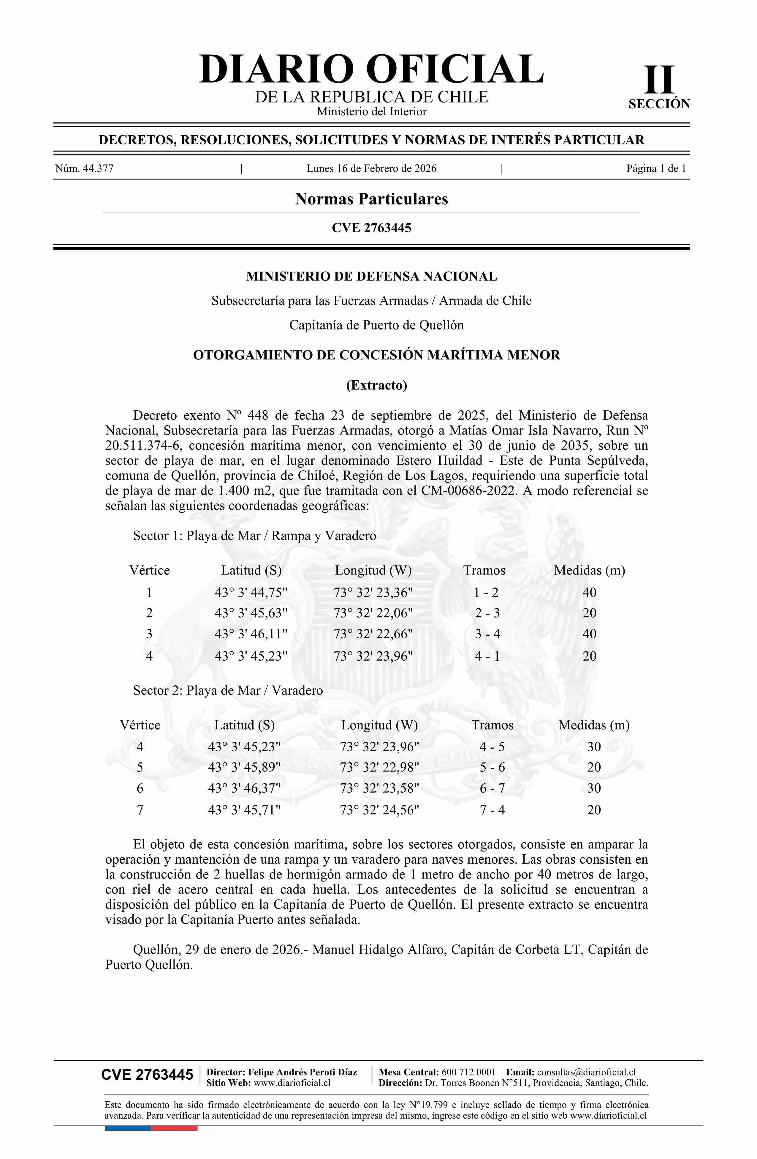 | Título: | Extracto de decreto exento número 448, de 2025.- Otorgamiento de concesión marítima menor |