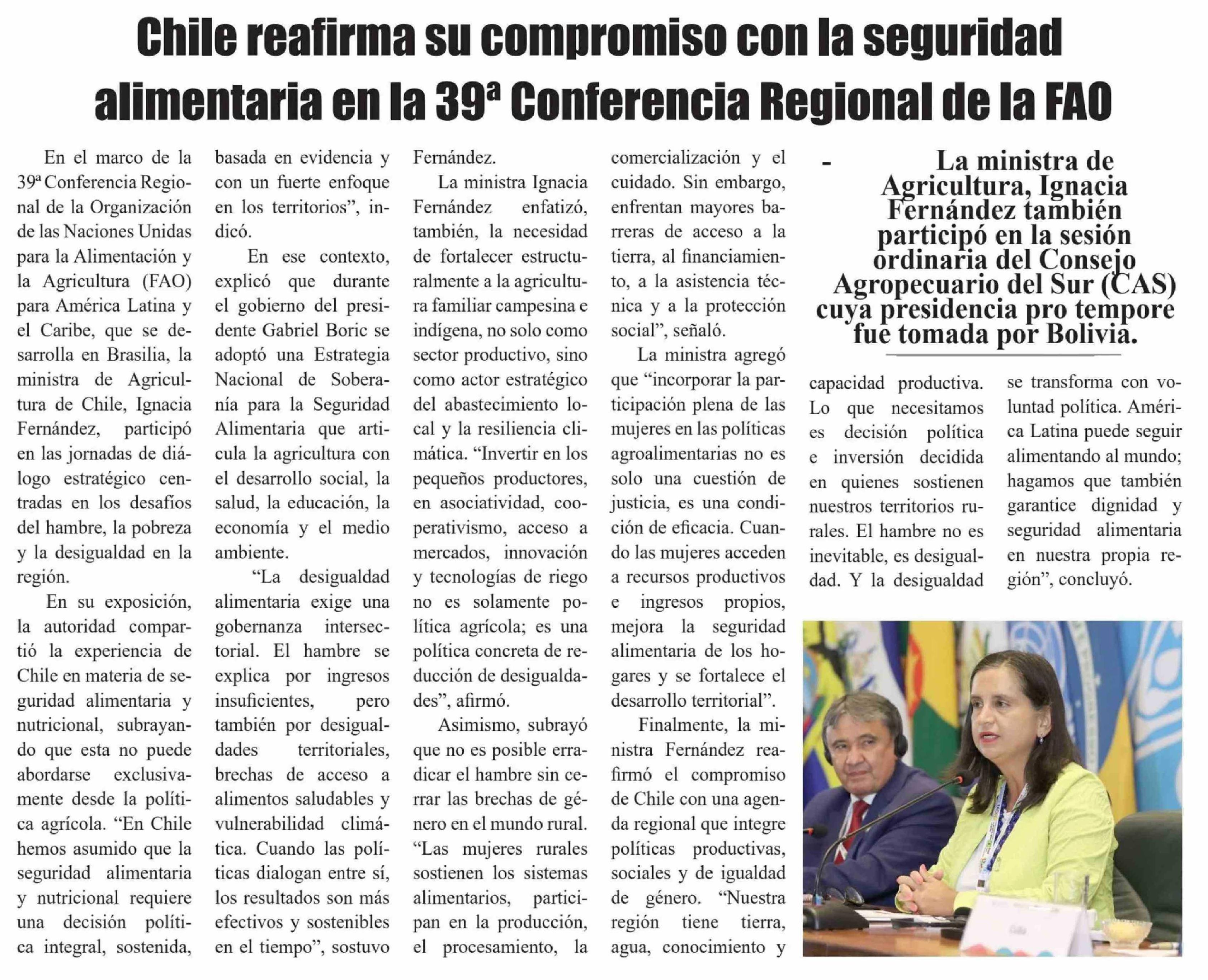 Chile reafirma su compromiso con la seguridad alimentaria en la 39ª Conferencia Regional de la FAO