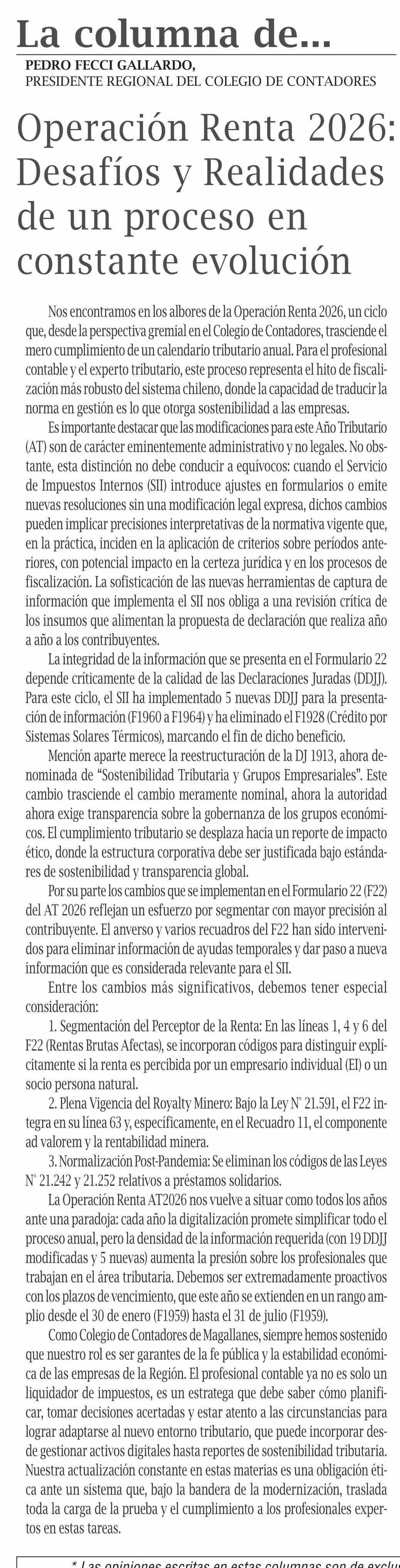 | Título: | Columnas de Opinión: Nos encontramos en los albores de la Operación Renta 2026, un ciclo que, desde la perspectiva gremial en el Colegio de Contadores, trasciende el mero cumplimiento de un calendario tributario anual. Para el profesional contable y el experto tributario, este proceso representa el |