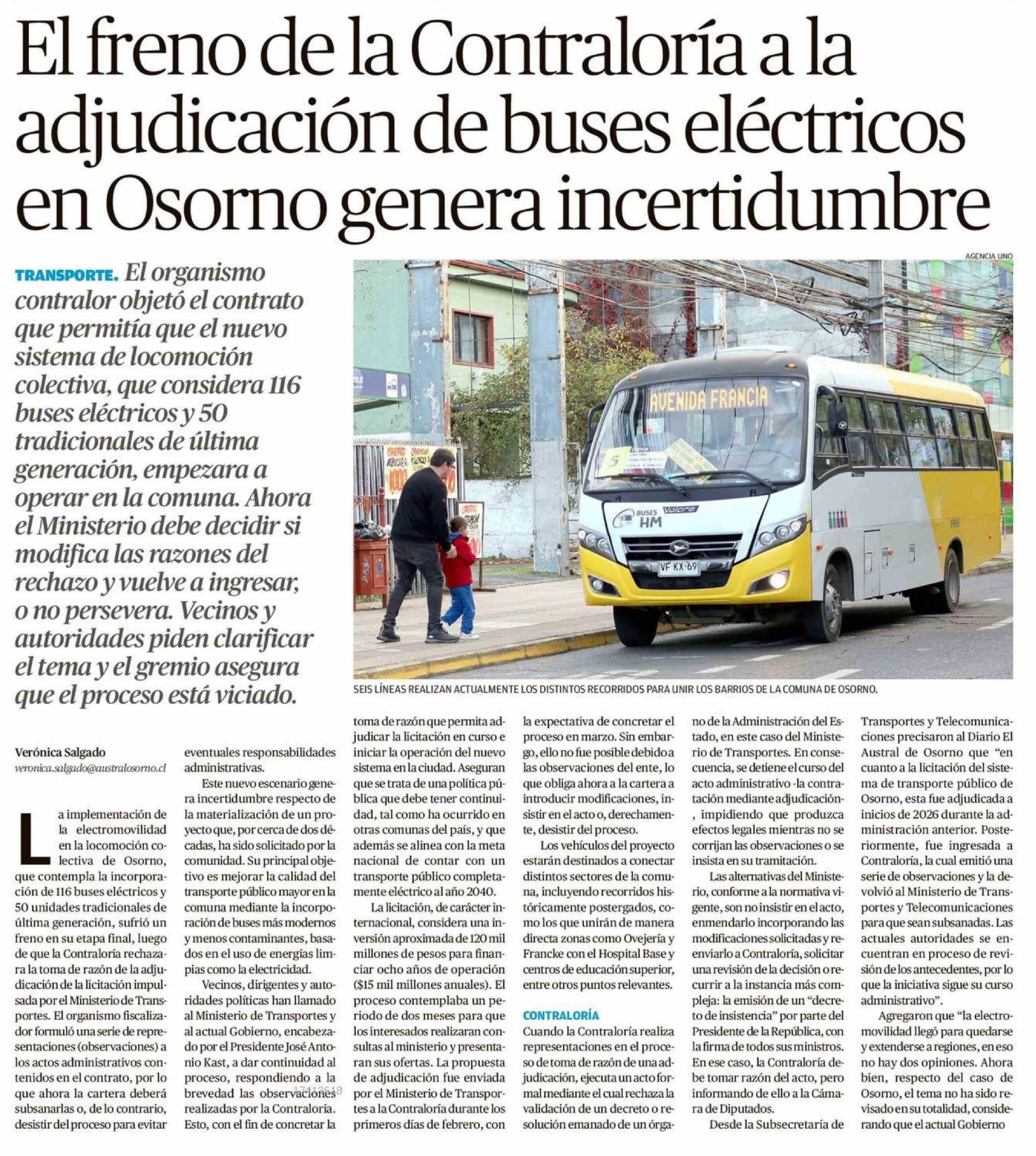 El freno de la Contraloría a la adjudicación de buses eléctricos en Osorno genera incertidumbre
