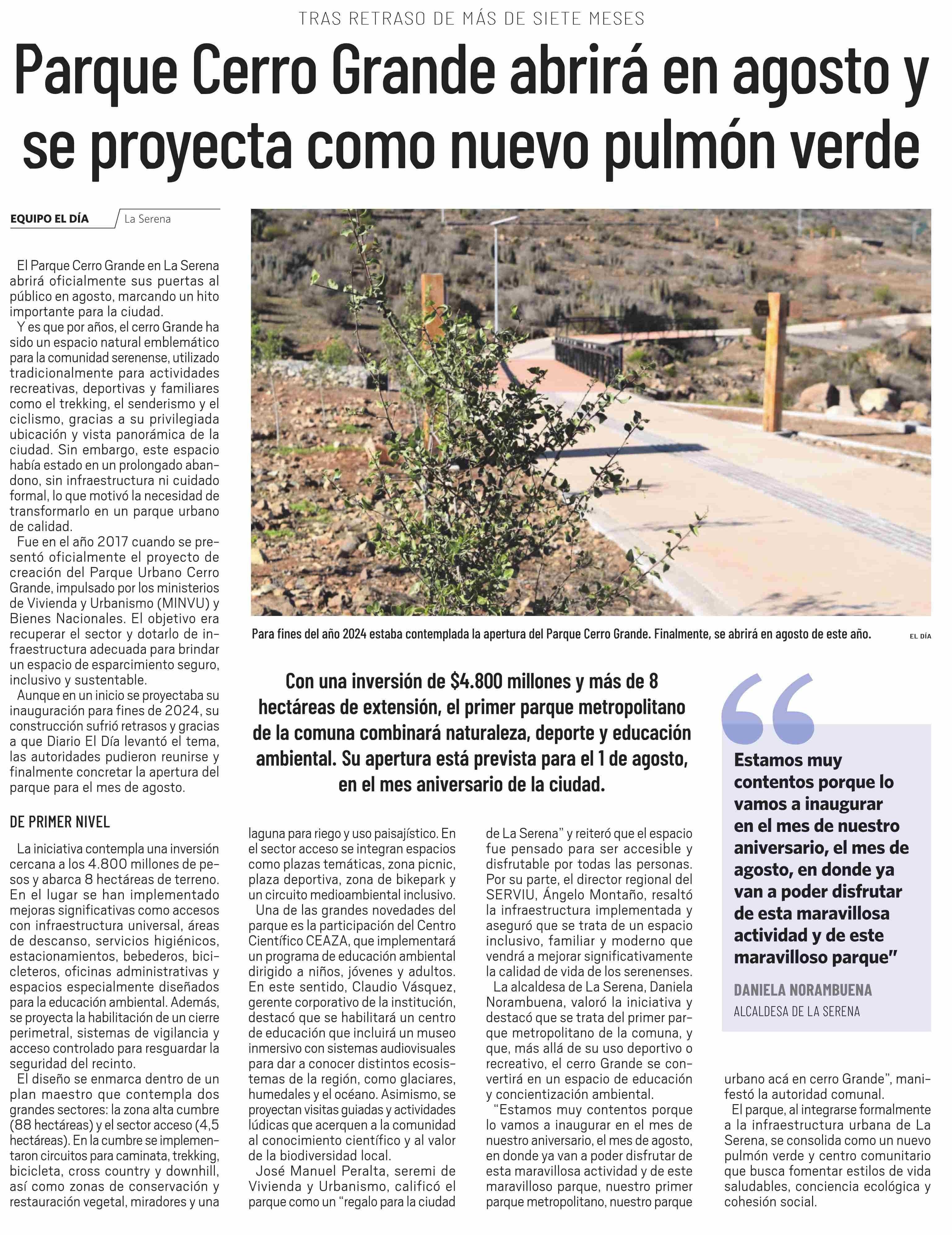 Parque Cerro Grande abrirá en agosto y se proyecta como nuevo pulmón verde