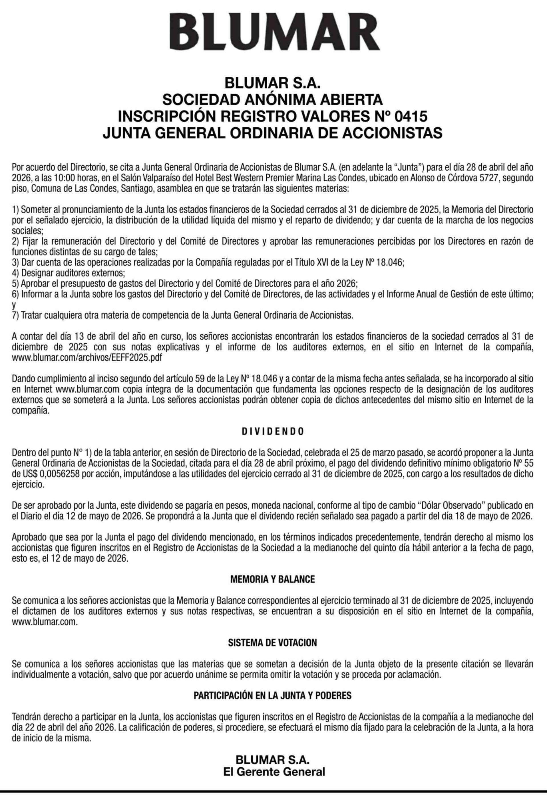 BLUMAR S.A. SOCIEDAD ANÓNIMA ABIERTA INSCRIPCIÓN REGISTRO VALORES Nº 0415 JUNTA GENERAL ORDINARIA DE ACCIONISTAS