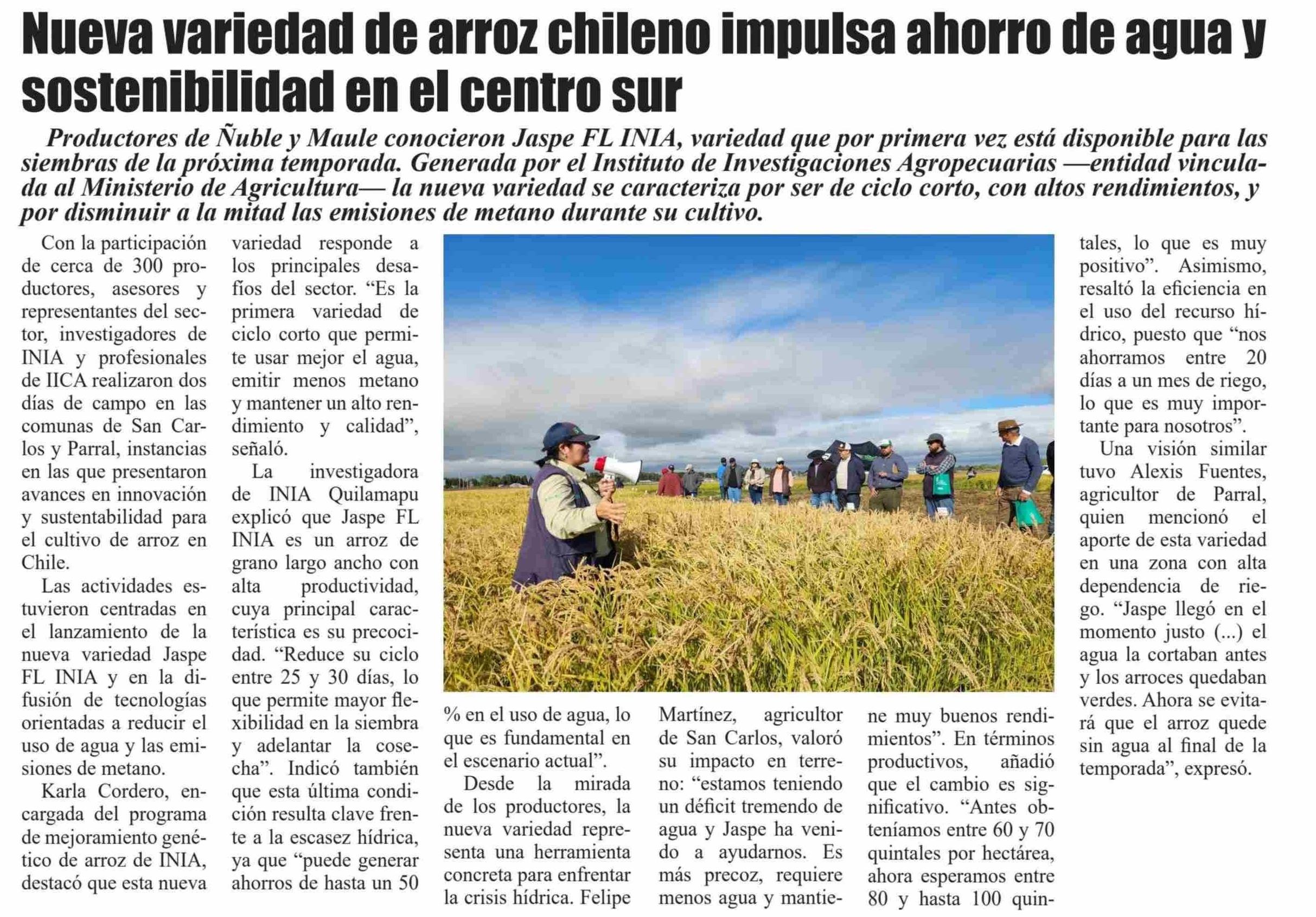 Nueva variedad de arroz chileno impulsa ahorro de agua y sostenibilidad en el centro sur