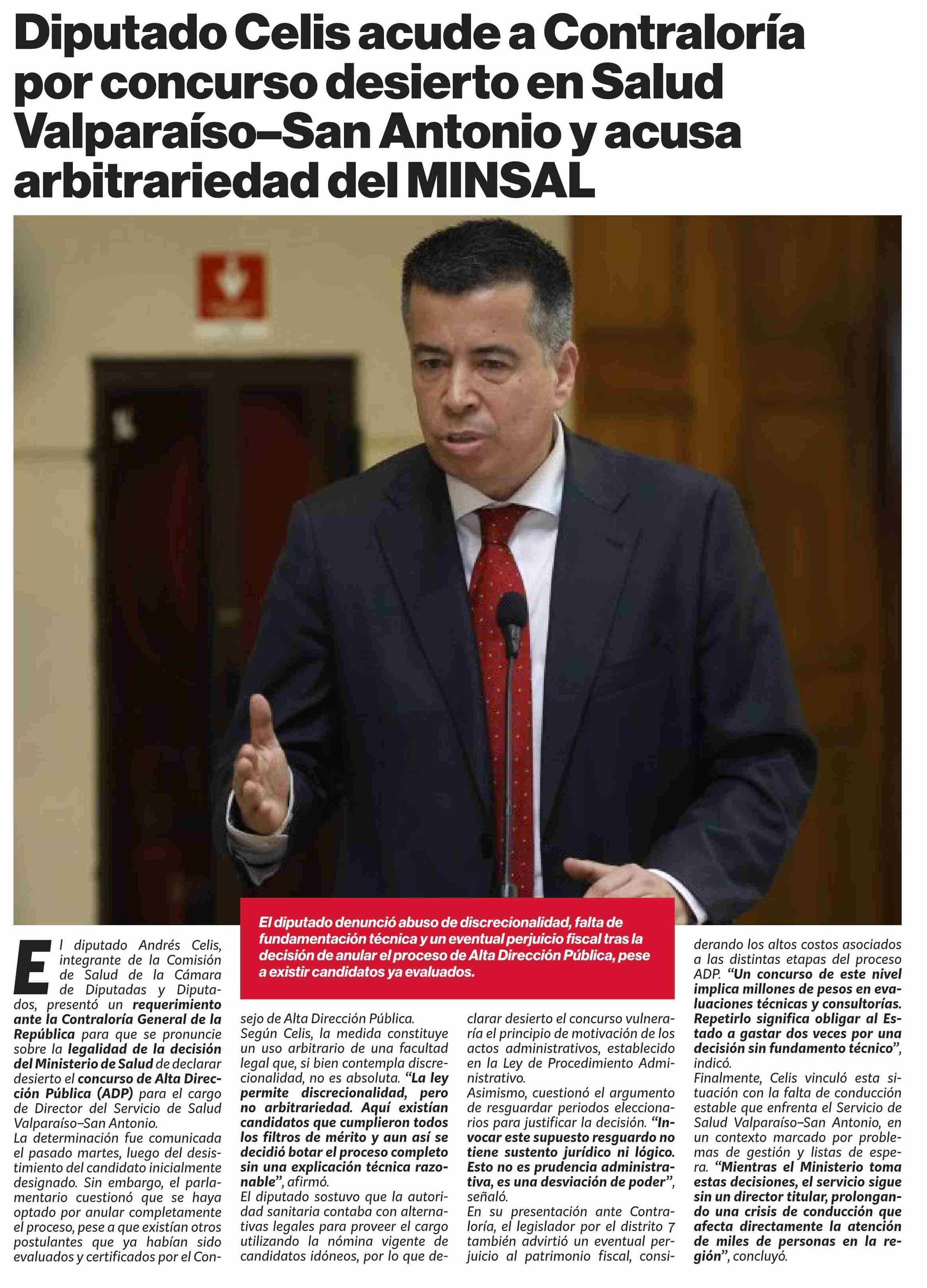 Diputado Celis acude a Contraloría por concurso desierto en Salud Valparaiso-San Antonio y acusa arbitrariedad del MINSAL