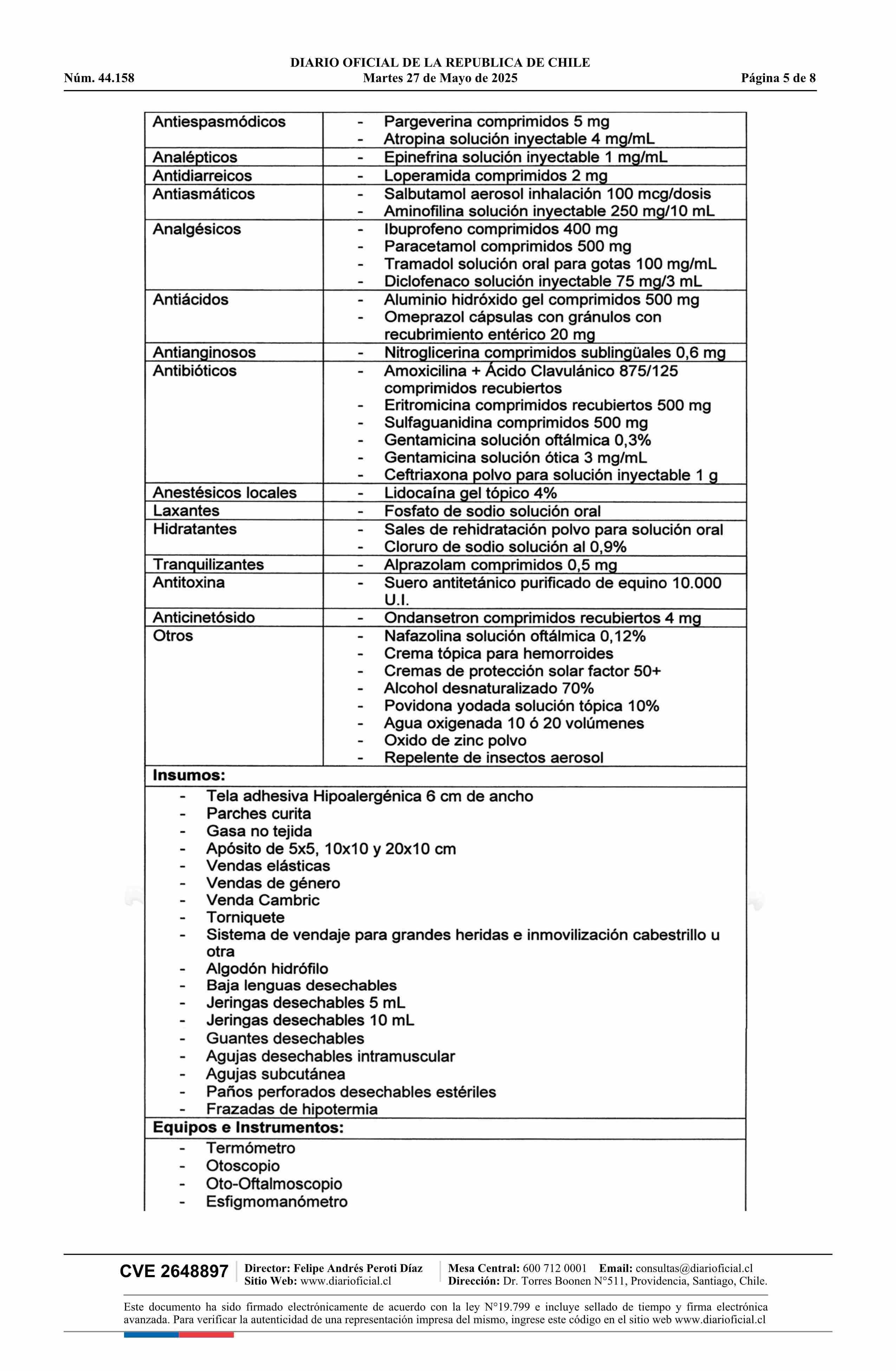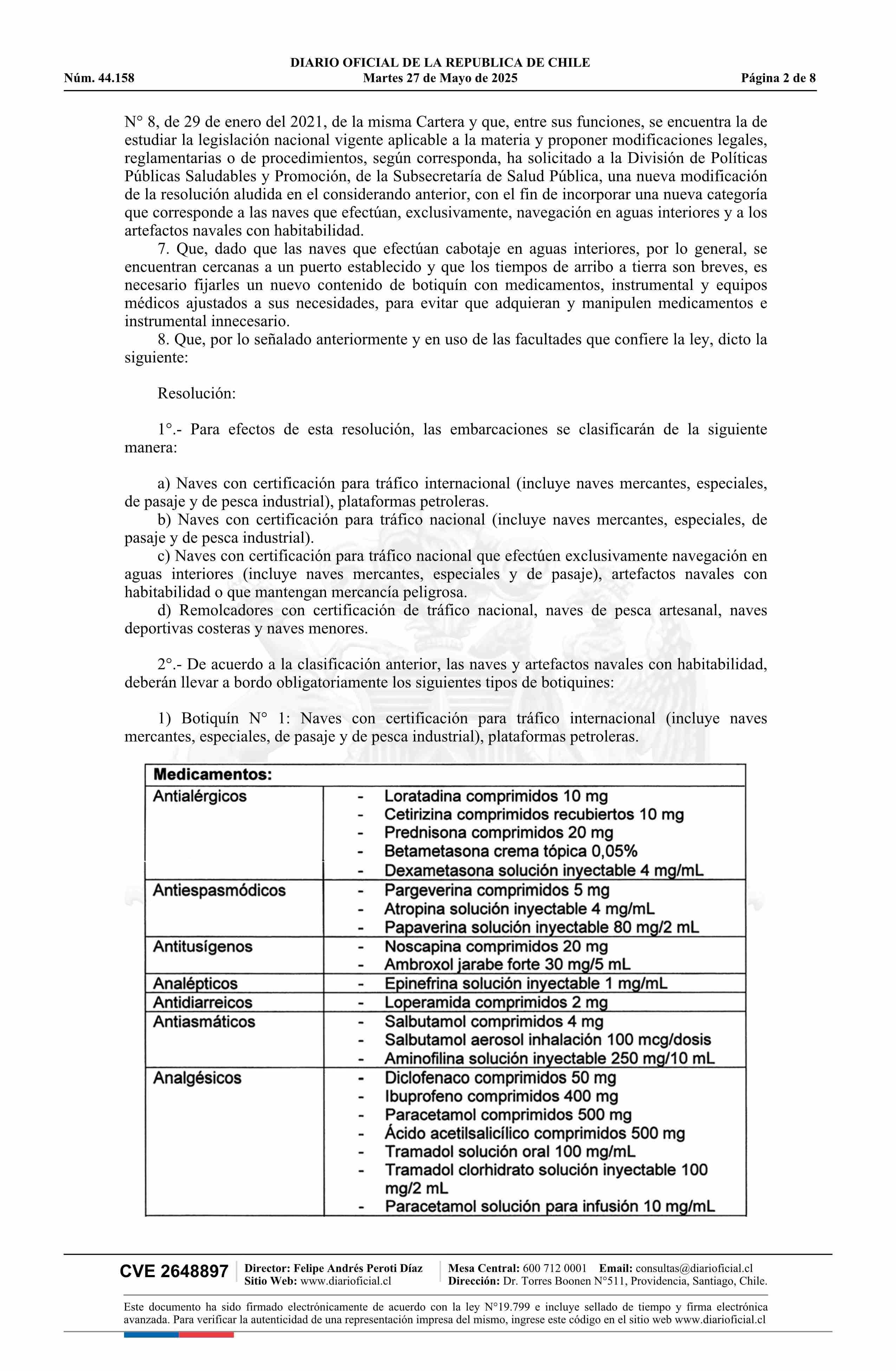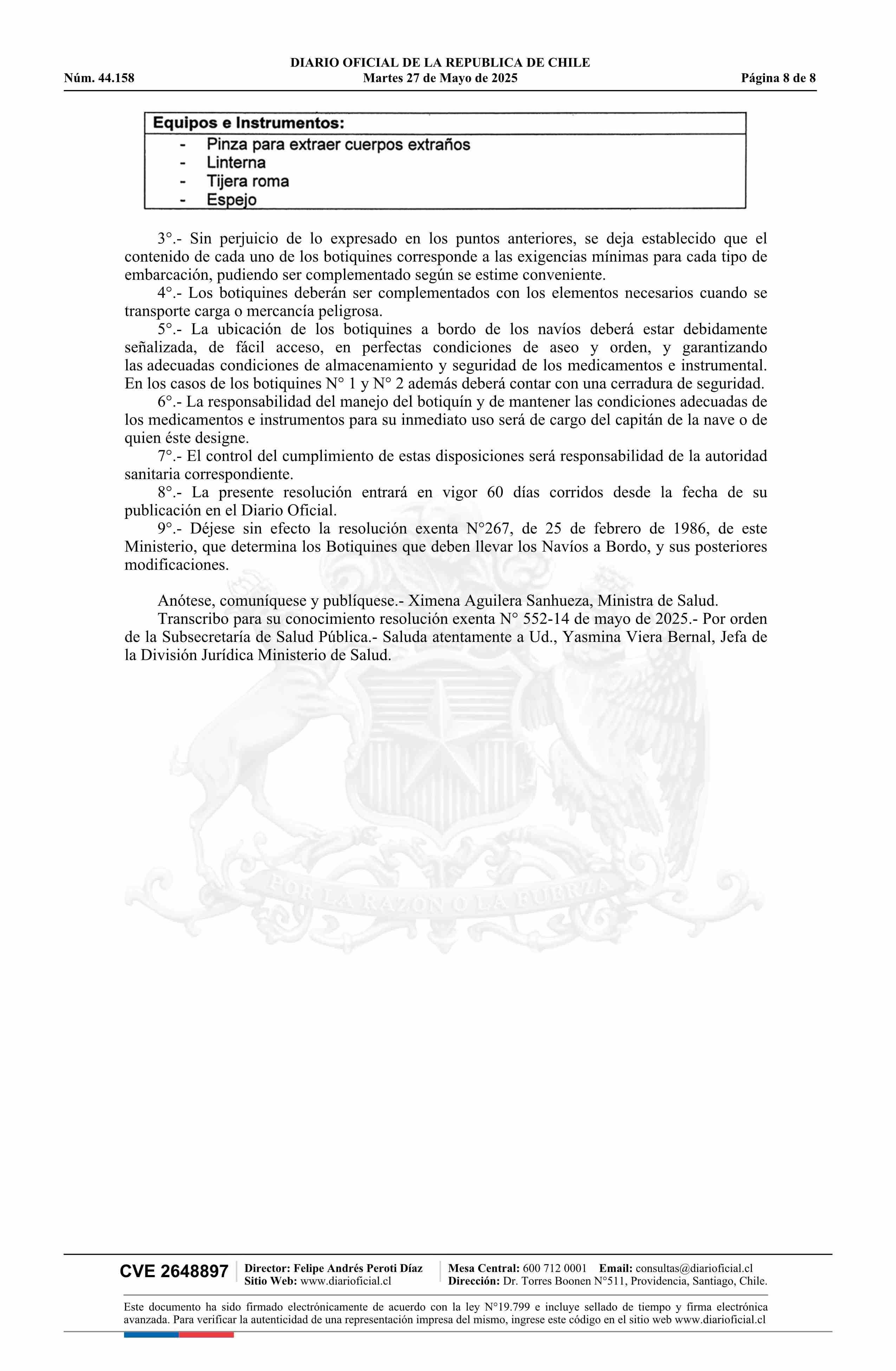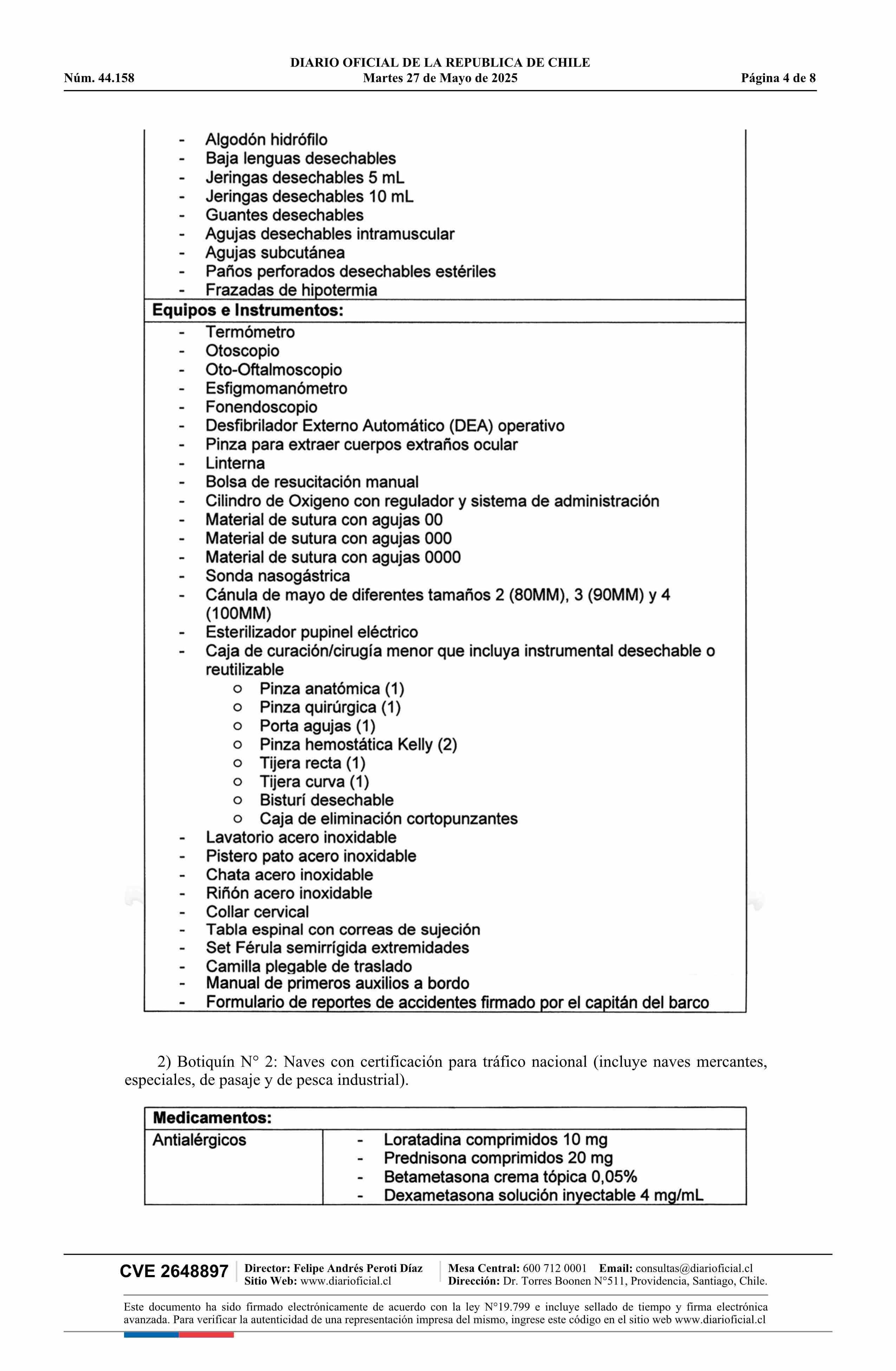 | Título: | Resolución exenta número 552, de 2025.- Determina los botiquines de medicamentos, instrumental y equipo médico que deben llevar las naves y artefactos navales??????? |