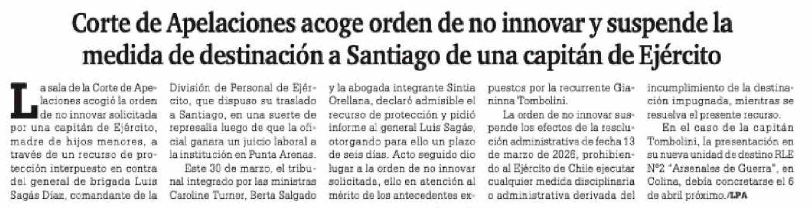 | Título: | Corte de Apelaciones acoge orden de no innovar y suspende la medida de destinación a Santiago de una capitán de Ejército |
