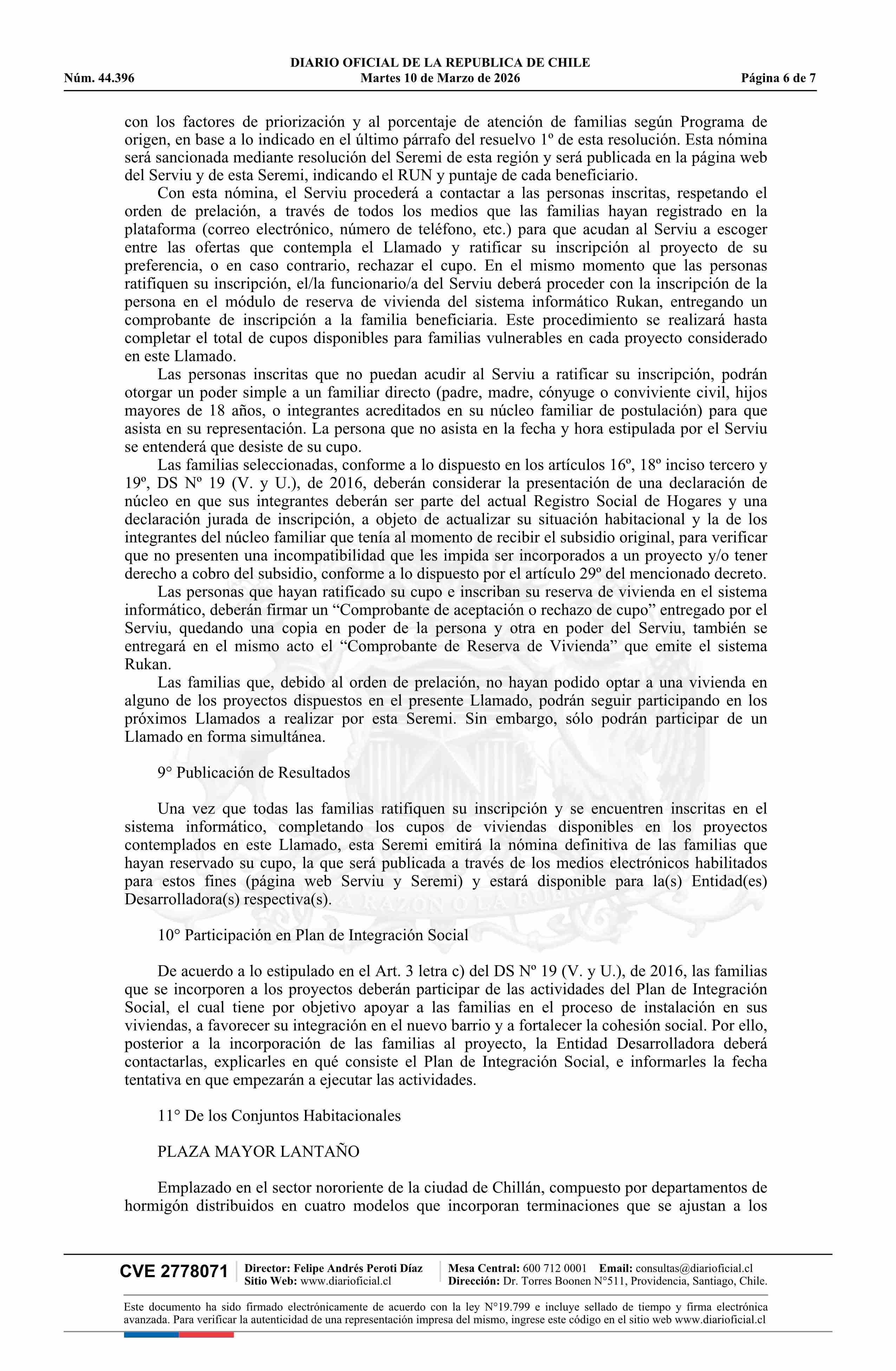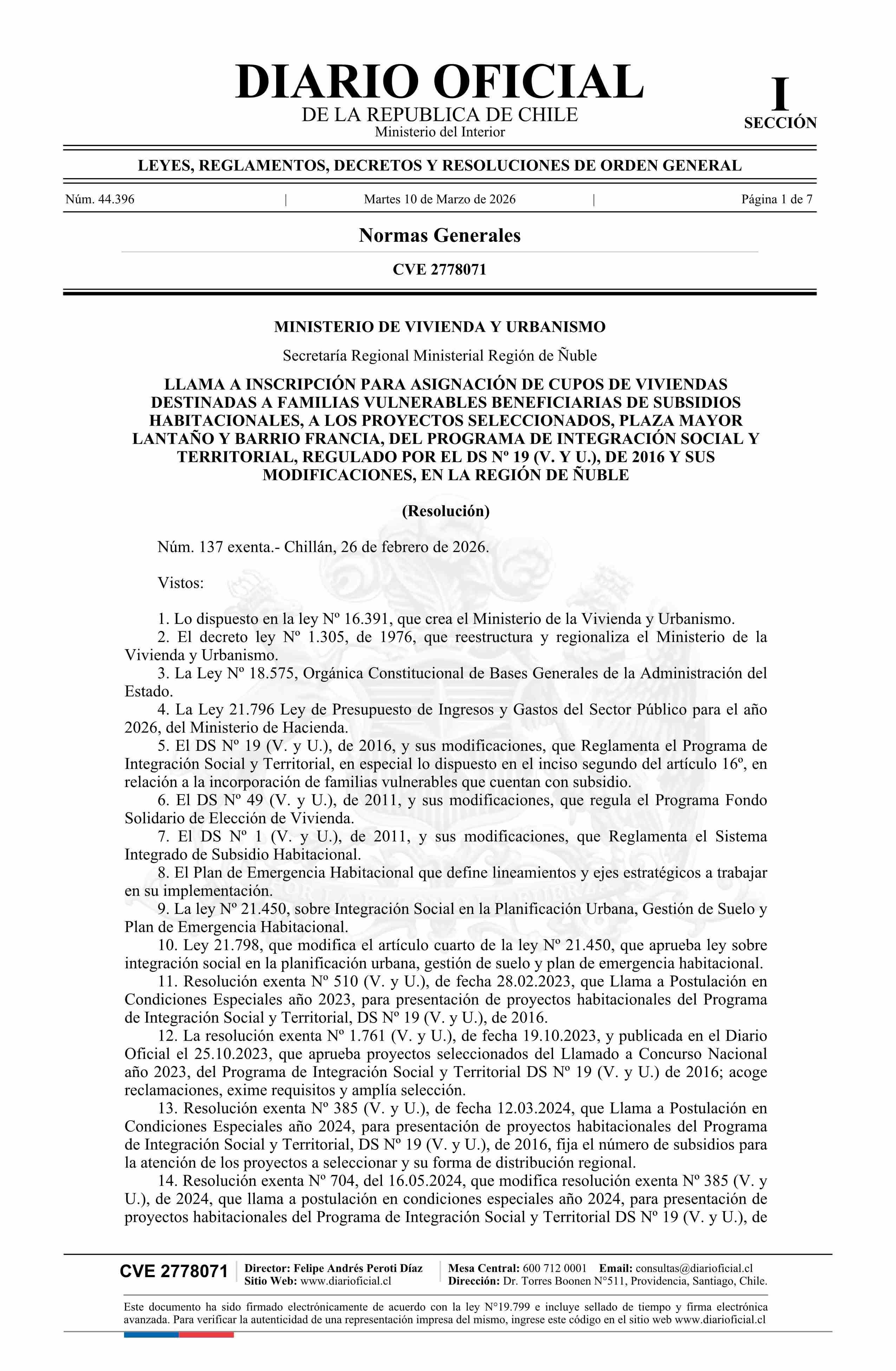 | Título: | Resolución exenta número 137, de 2026.- Llama a inscripción para asignación de cupos de viviendas destinadas a familias vulnerables beneficiarias de subsidios habitacionales, a los proyectos seleccionados, Plaza Mayor Lantaño y Barrio Francia, del Programa de Integración Social y Territorial, regula |