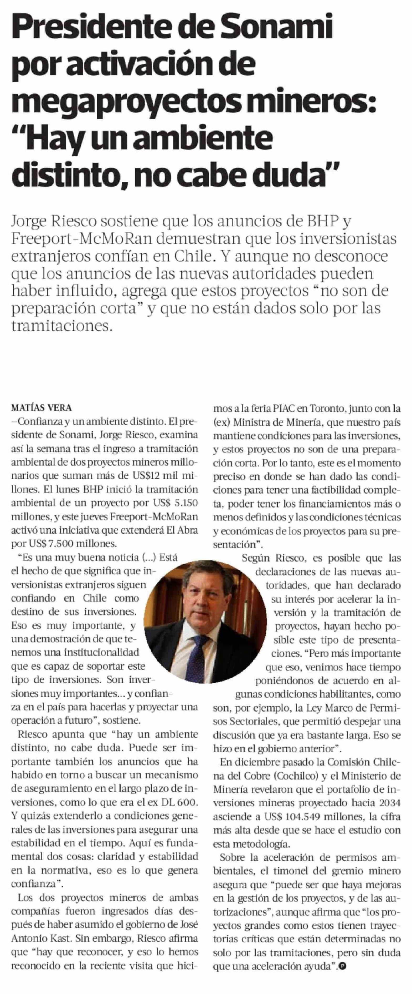 Presidente de Sonami por activación de megaproyectos mineros: "Hay un ambiente distinto, no cabe duda"