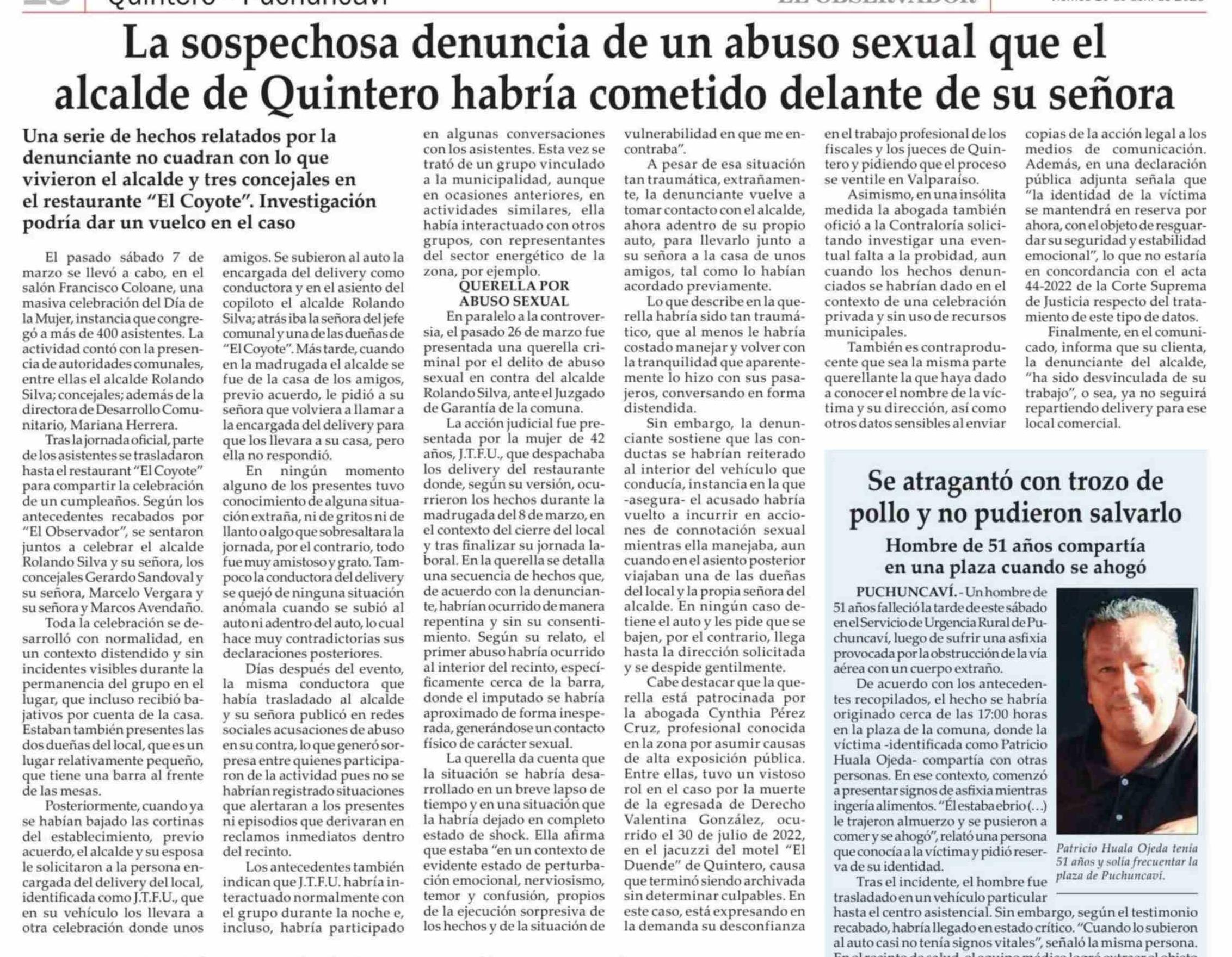 La sospechosa denuncia de un abuso sexual que el alcalde de Quintero habría cometido delante de su señora