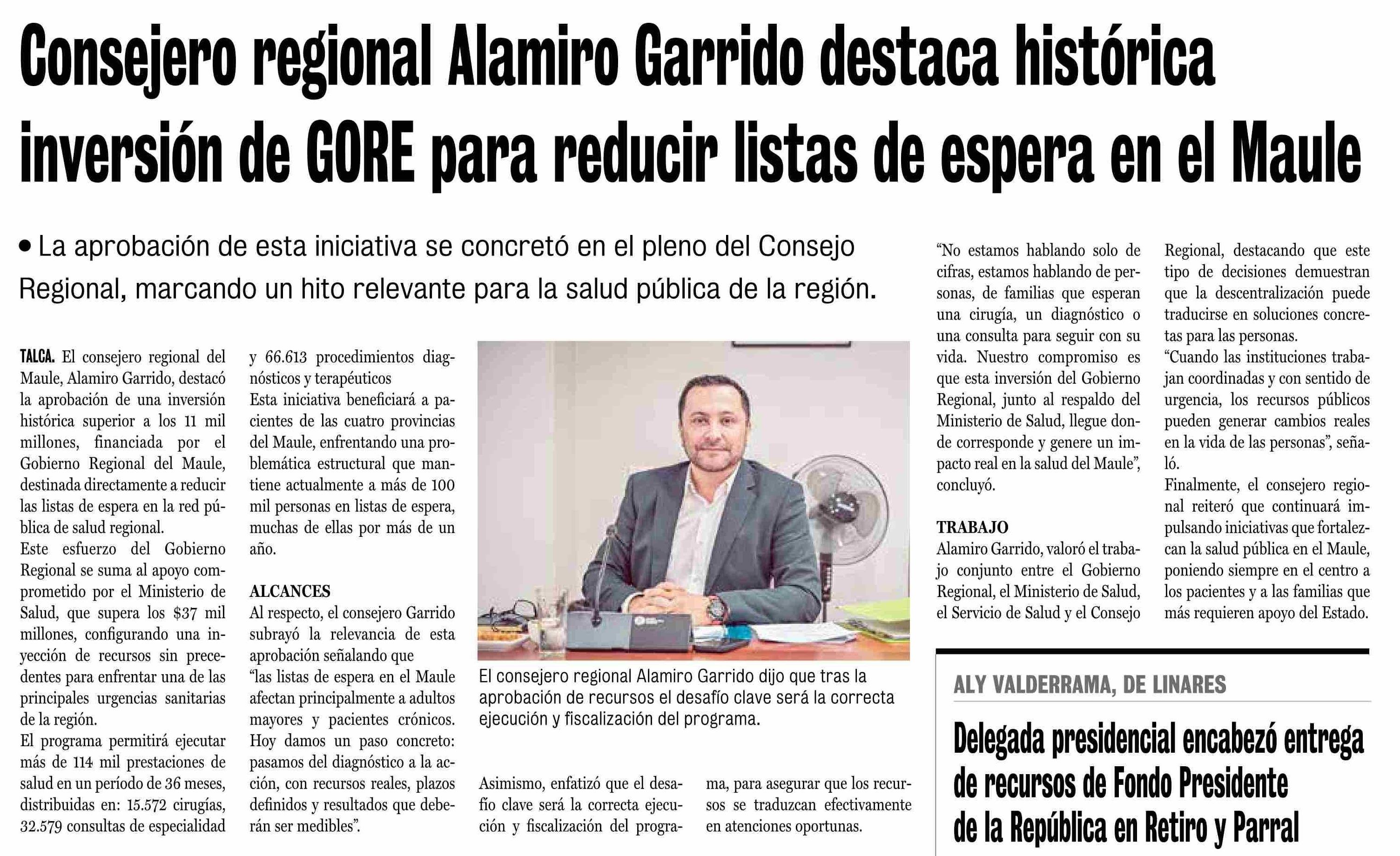 Título: Consejero regional Alamiro Garrido destaca histórica inversión de GORE para reducir listas de espera en el Maule