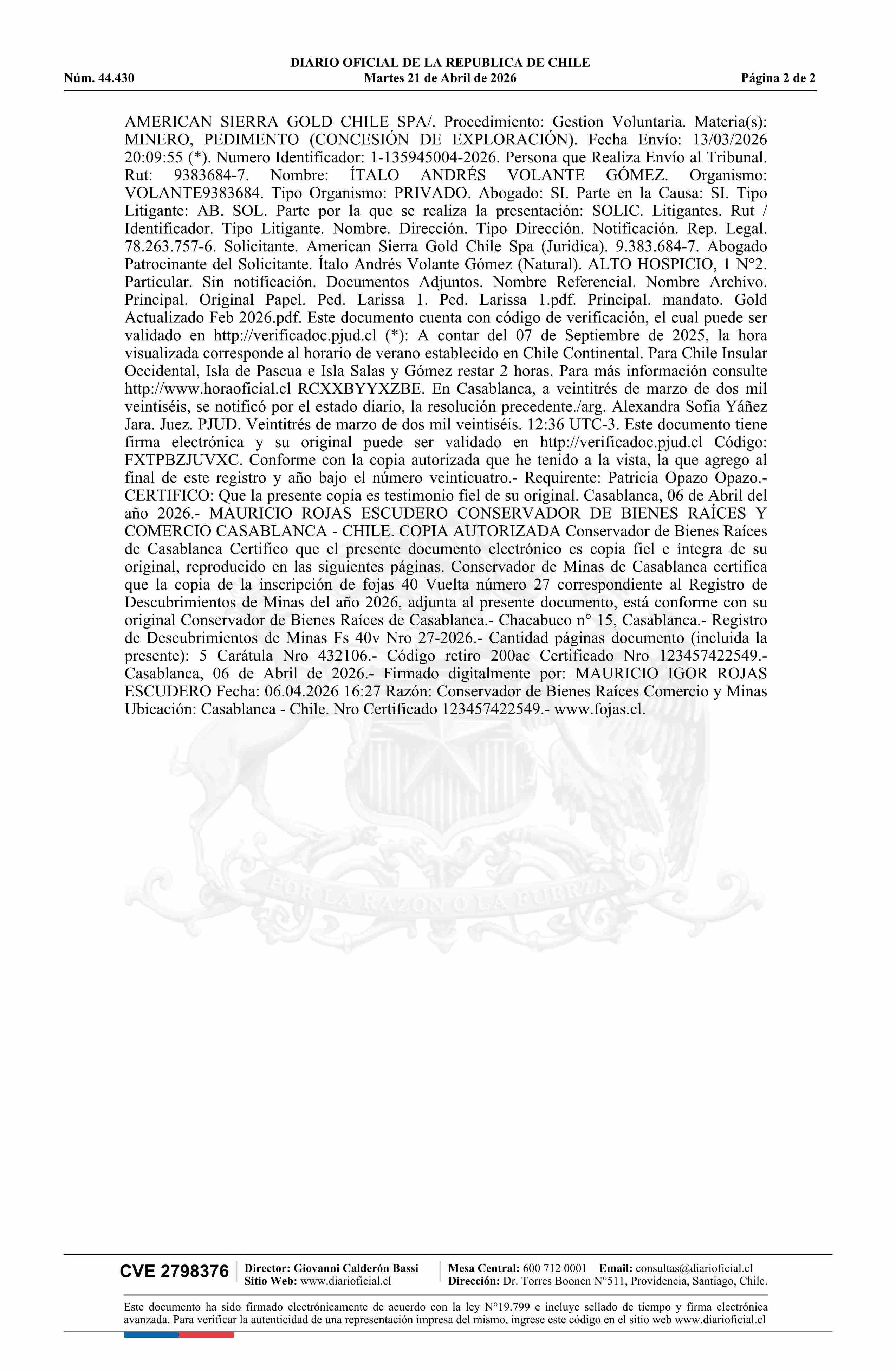DIARIO OFICIAL CHILE - BOLETÍN OFICIAL DE MINERÍA (DIARIO OFICIAL CHILE – BOM – PEDIMENTOS MINEROS)