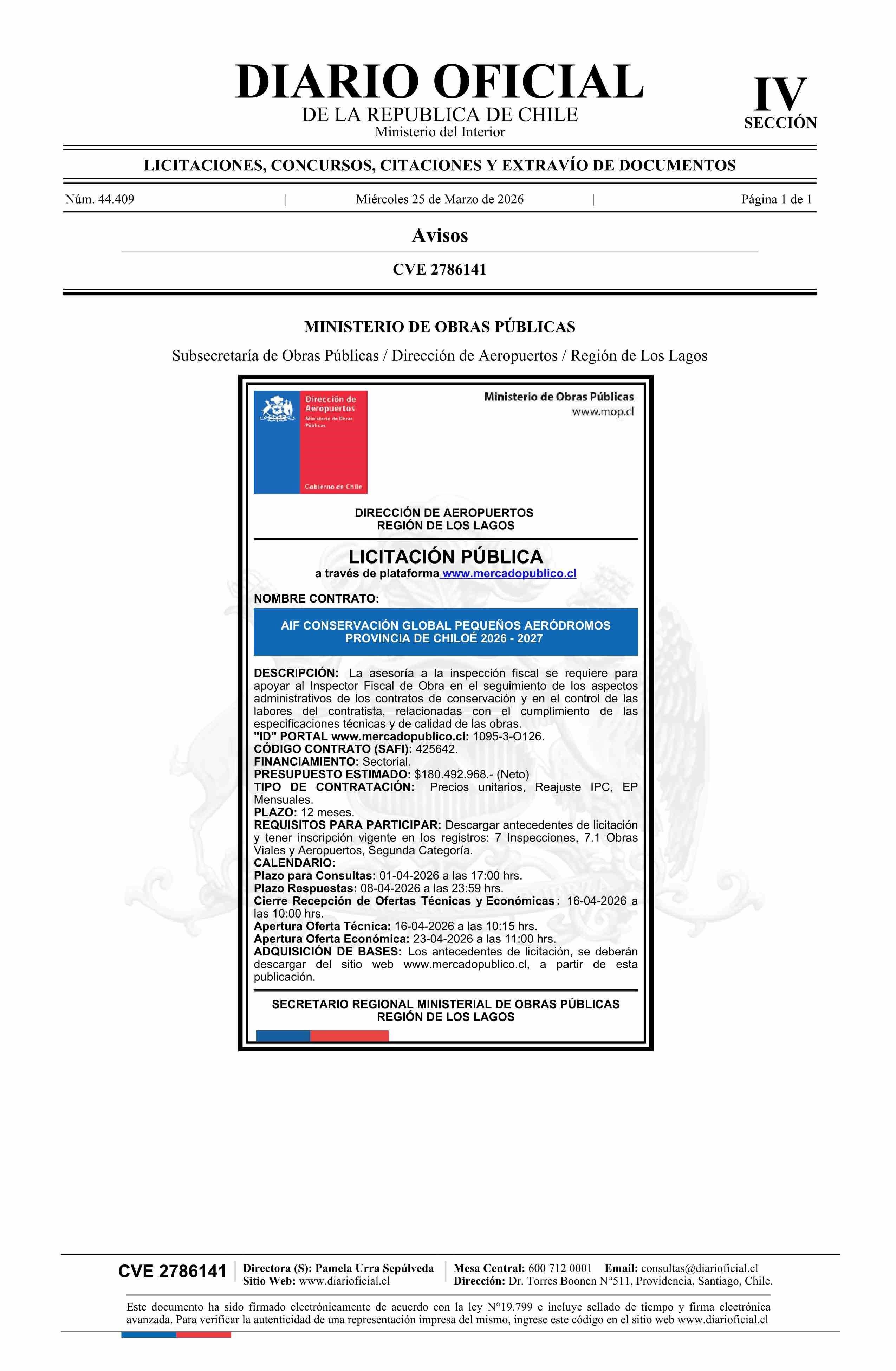 | Título: | AVISO LICITACIONES: AIF Conservación Global Pequeños Aeródromos Provincia de Chiloé 2026 - 2027 |