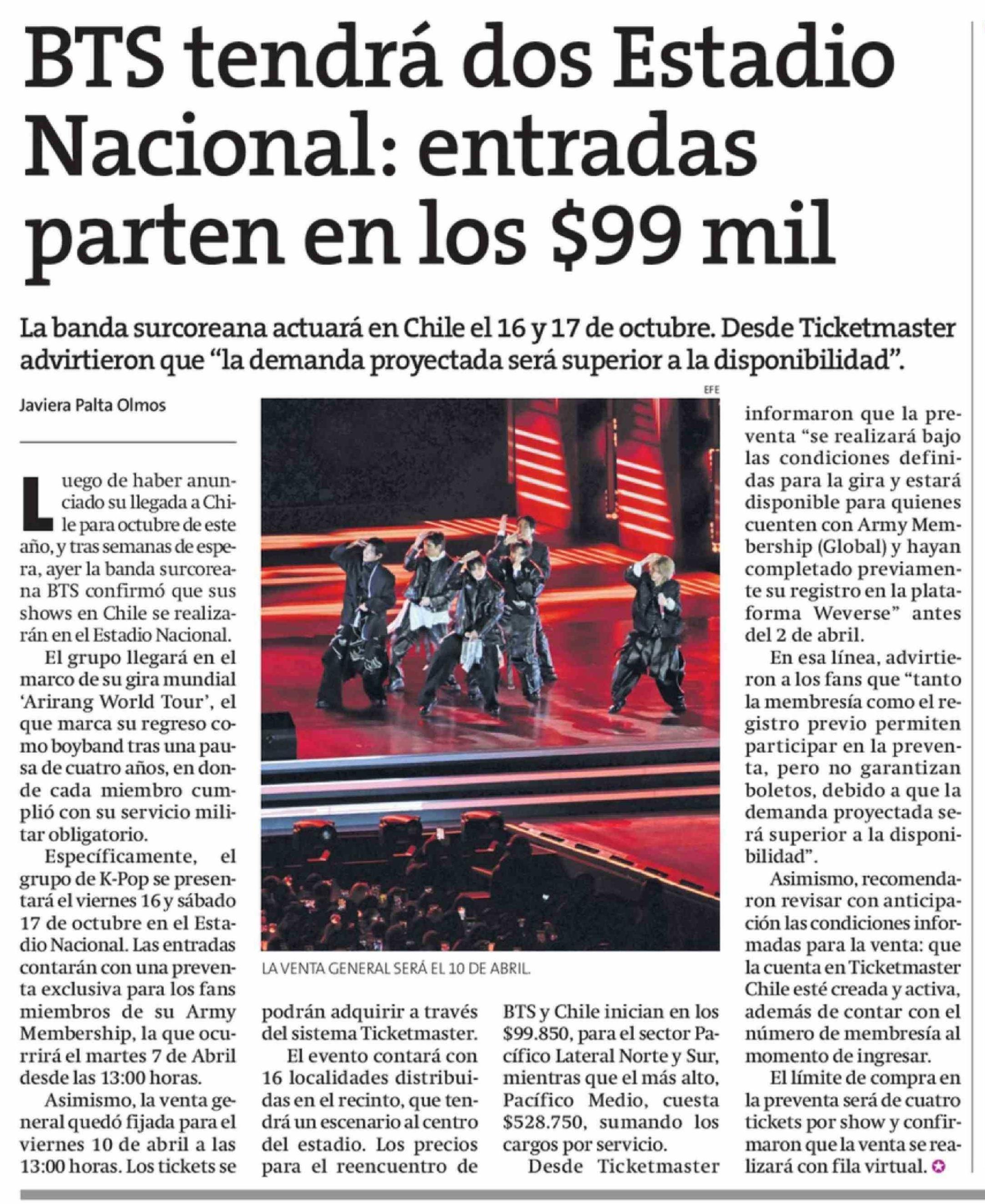 Título: BTS tendrá dos Estadio Nacional: entradas parten en los $99 mil