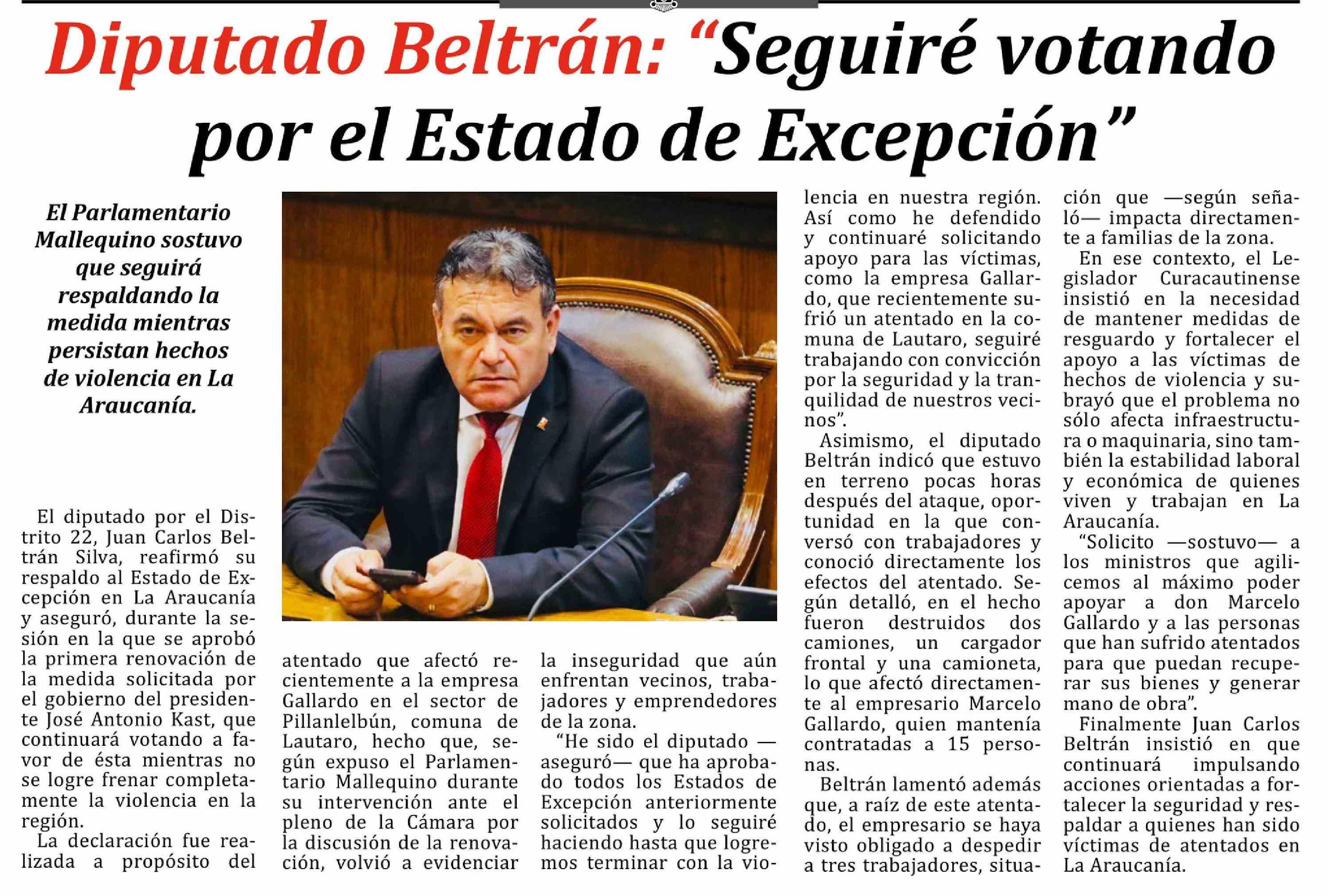 Diputado Beltrán: "Seguiré votando por el Estado de Excepción"