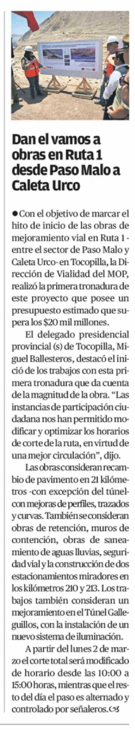 Dan el vamos a obras en Ruta 1 desde Paso Malo a Caleta Urco
