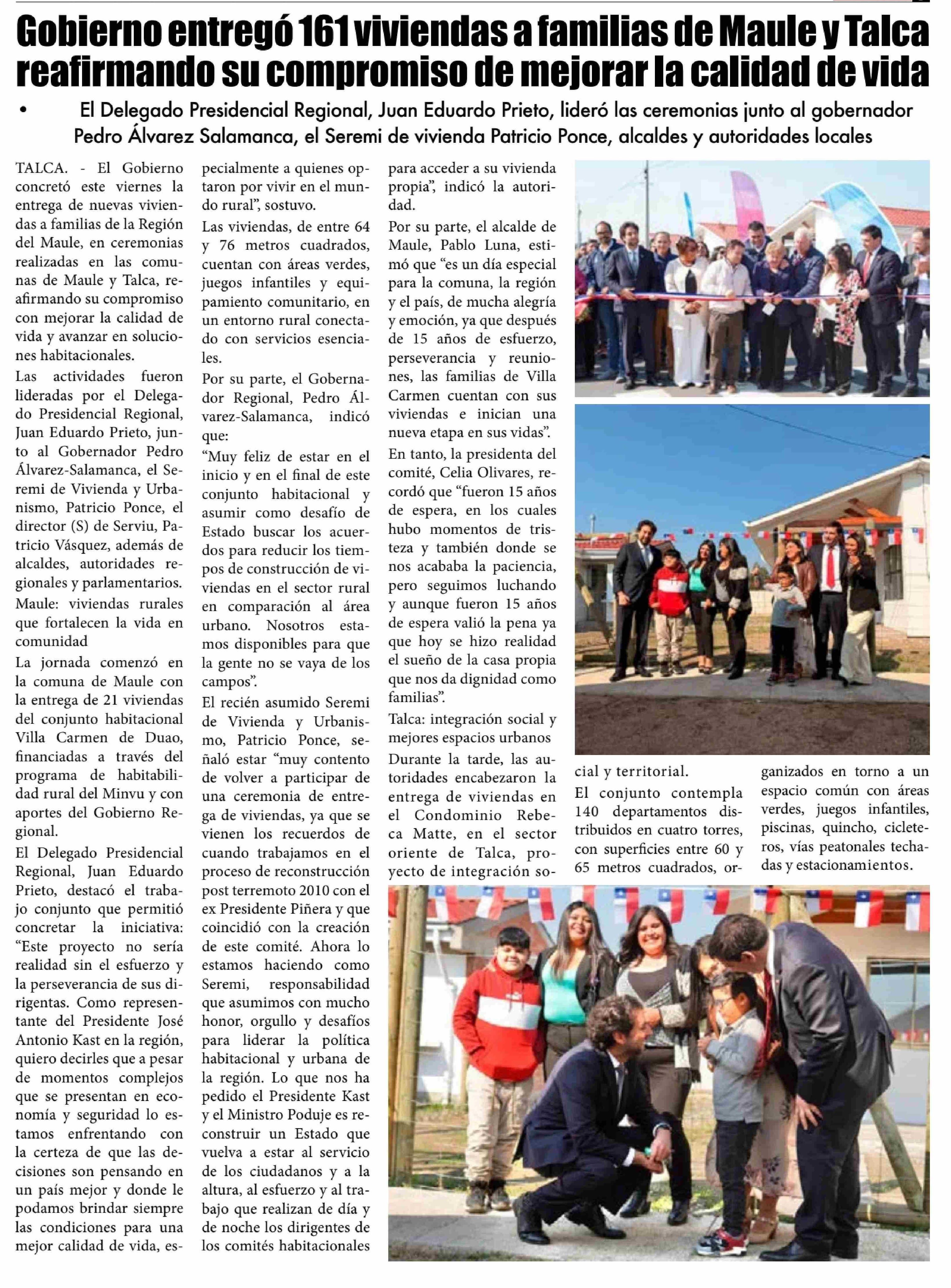 Gobierno entregó 161 viviendas a familias de Maule y Talca reafirmando su compromiso de mejorar la calidad de vida