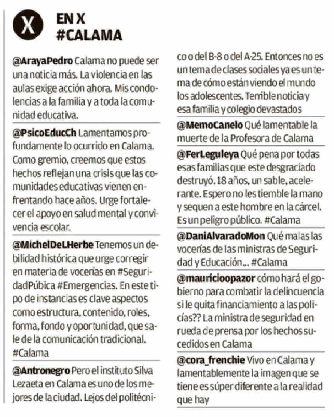 | Título: | @ArayaPedro Calama no puede ser una noticia más. La violencia en las aulas exige acción ahora. Mis condolencias a la familia y a toda la comunidad educativa. @PsicoEducCh Lamentamos profundamente lo ocurrido en Calama. Como gremio, creemos que estos hechos reflejan una crisis que las comunidades edu |