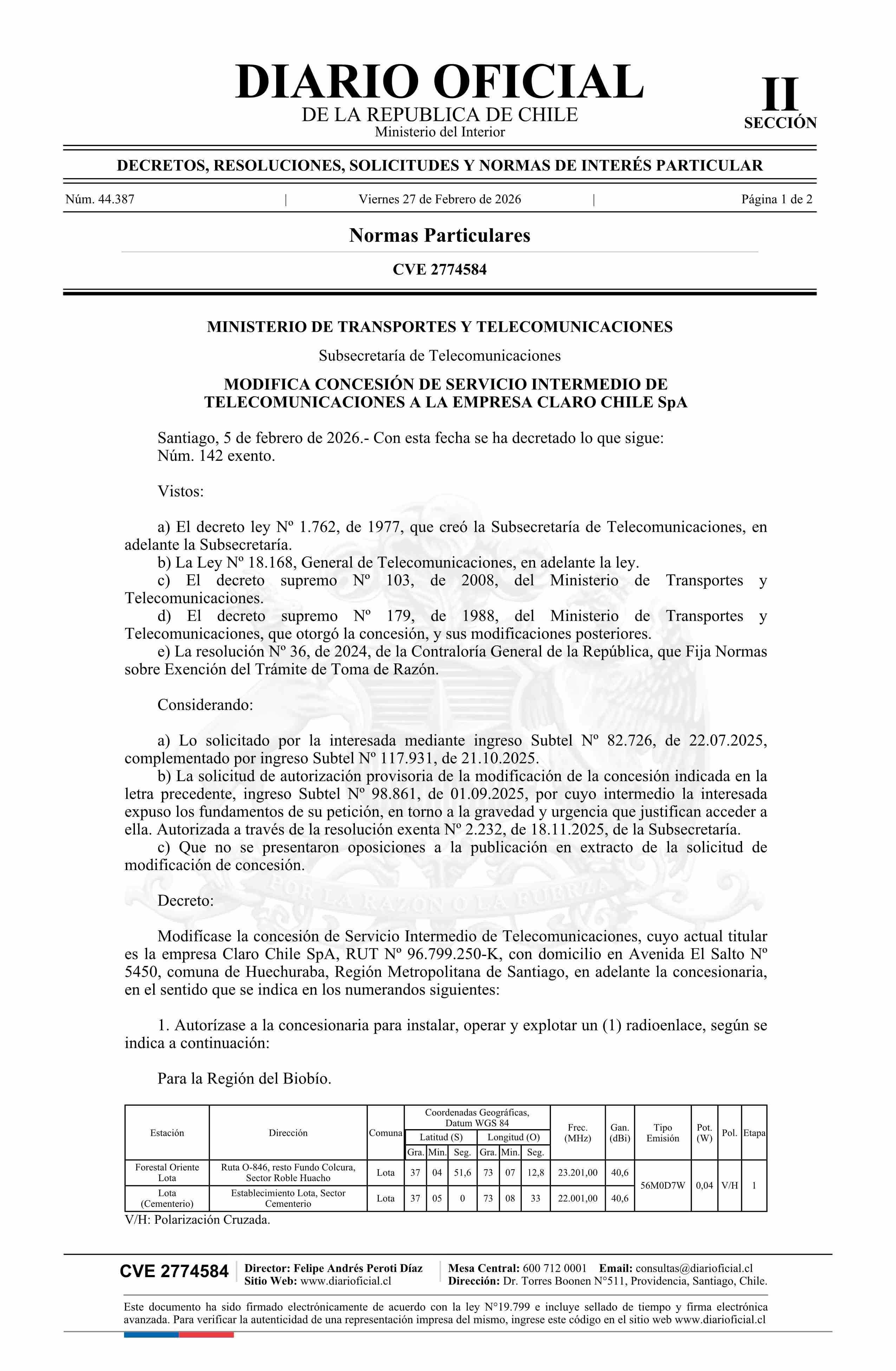 | Título: | Decreto exento número 142, de 2026.- Modifica concesión de servicio intermedio de telecomunicaciones a la empresa Claro Chile SpA |