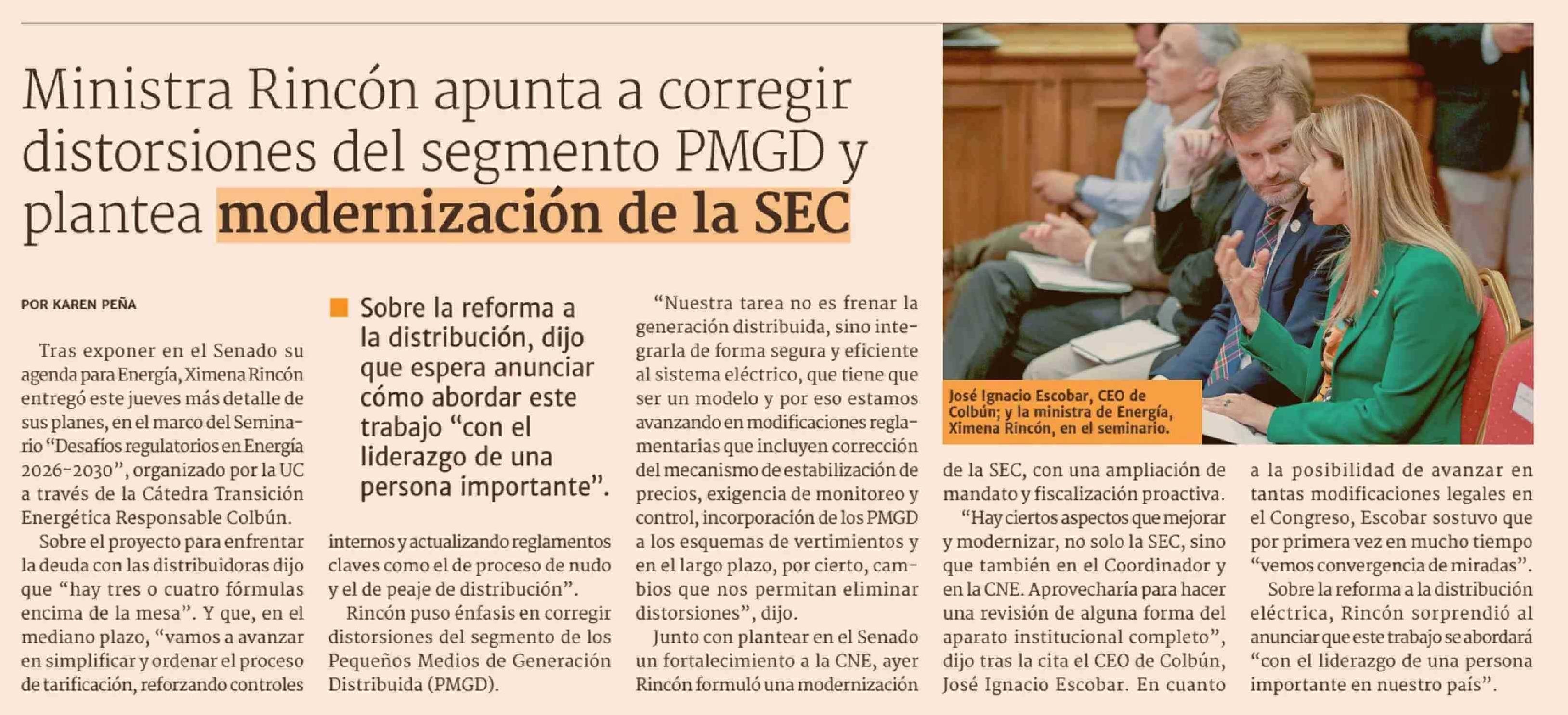 Ministra Rincón apunta a corregir distorsiones del segmento PMGD y plantea modernización de la SEC