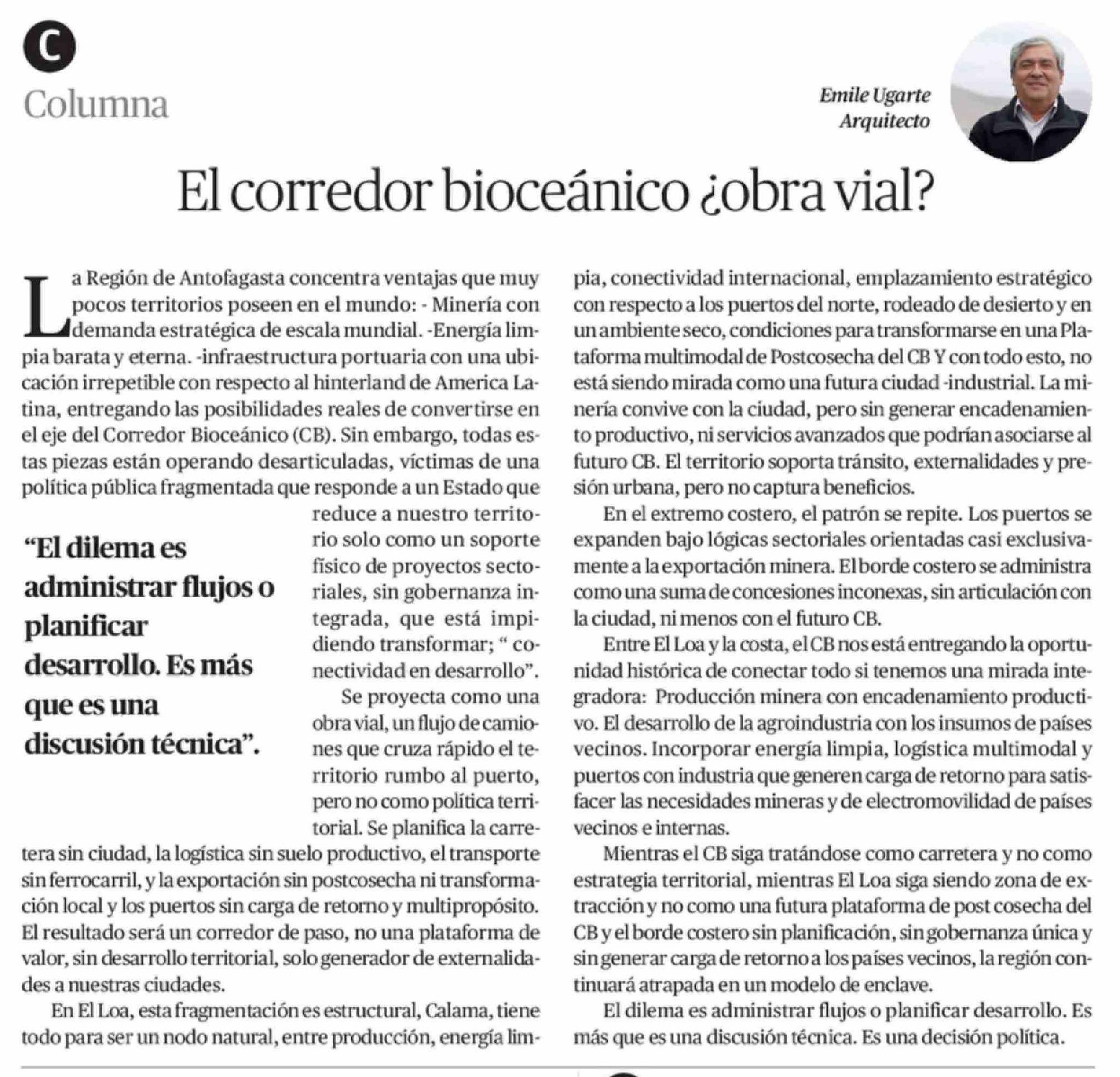 Columnas de Opinión: El corredor bioceánico ¿obra vial?