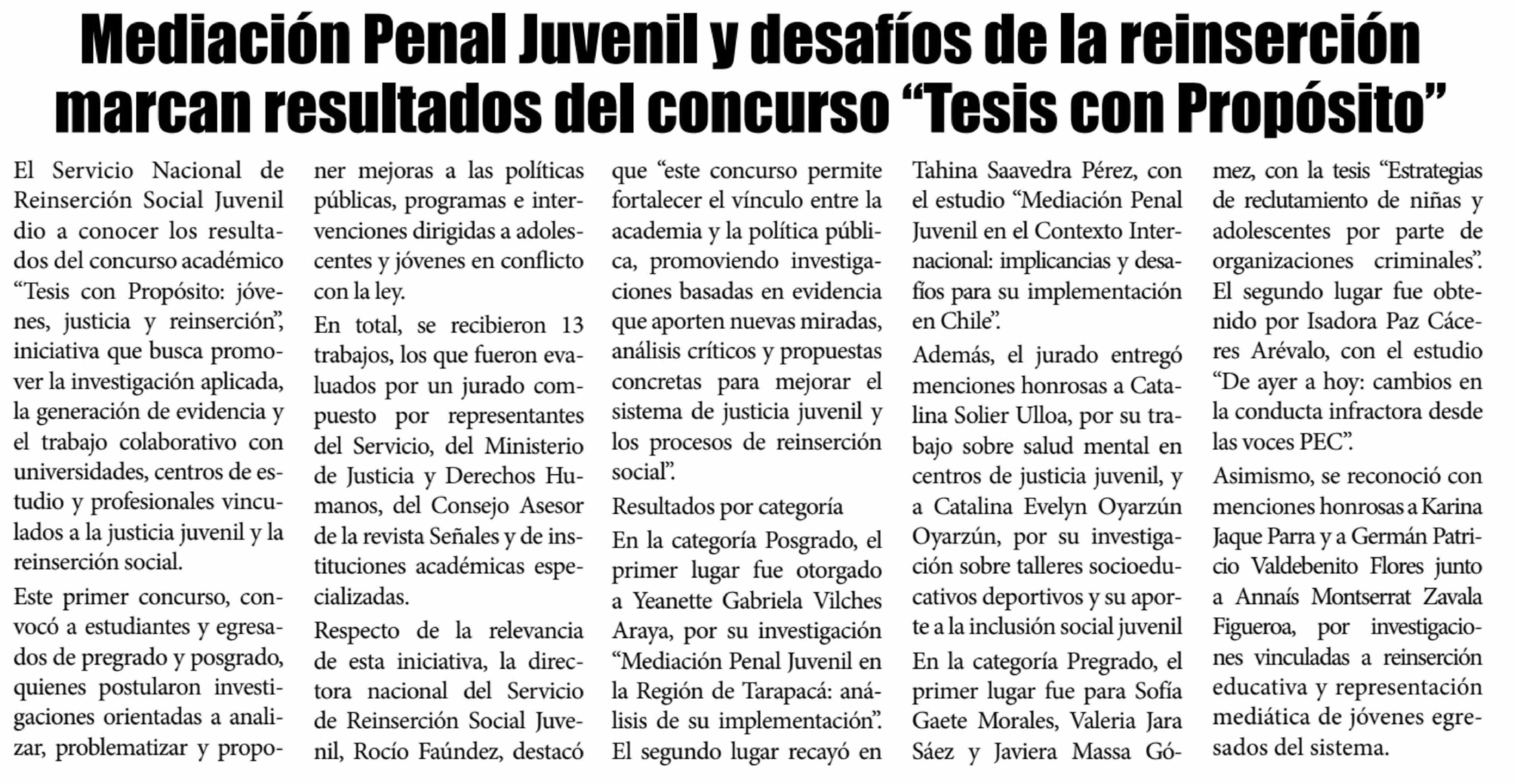 Mediación Penal Juvenil y desafíos de la reinserción marcan resultados del concurso "Tesis con Propósito"