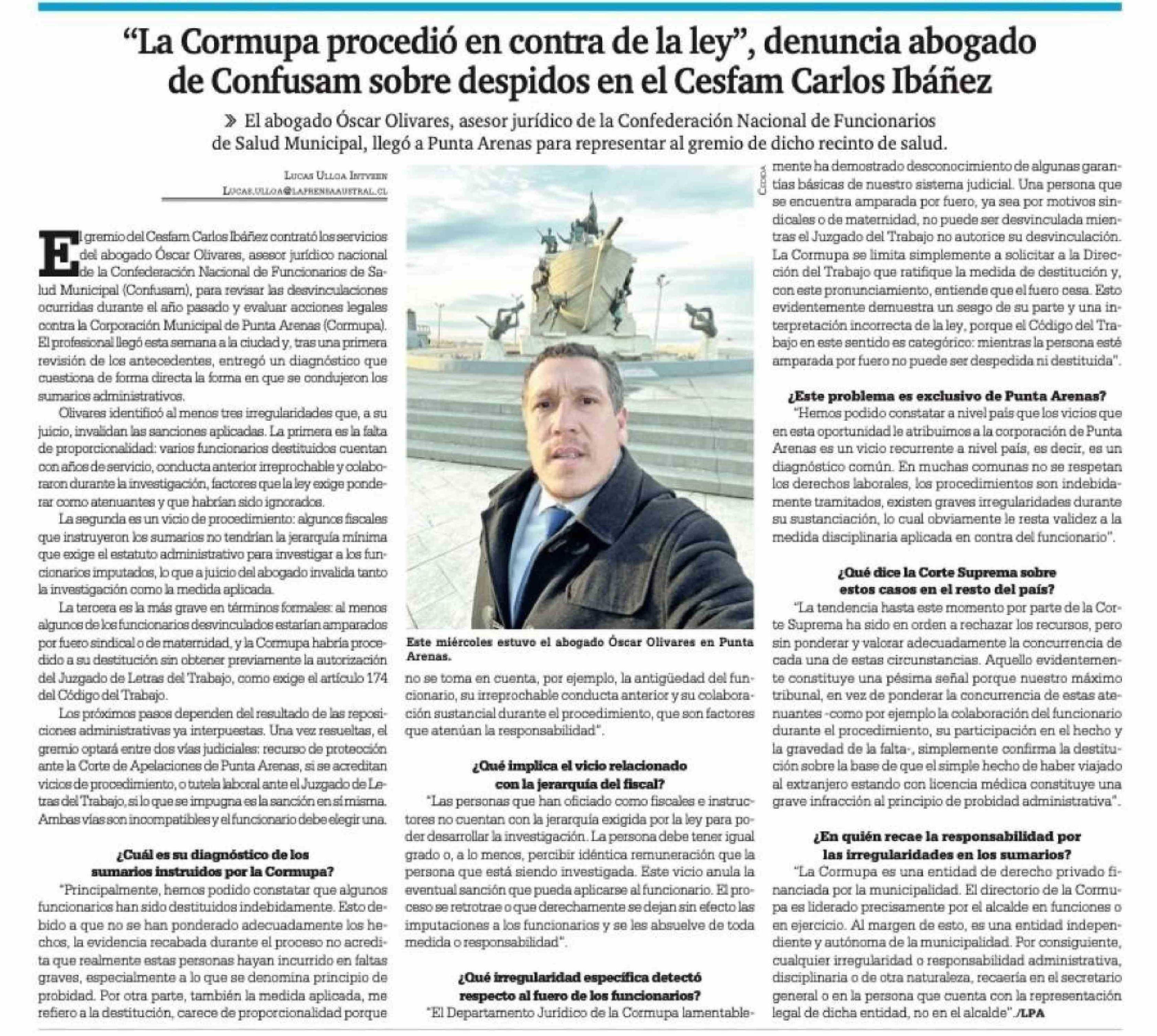 Título: “La Cormupa procedió en contra de la ley”, denuncia abogado de Confusam sobre despidos en el Cesfam Carlos Ibáñez