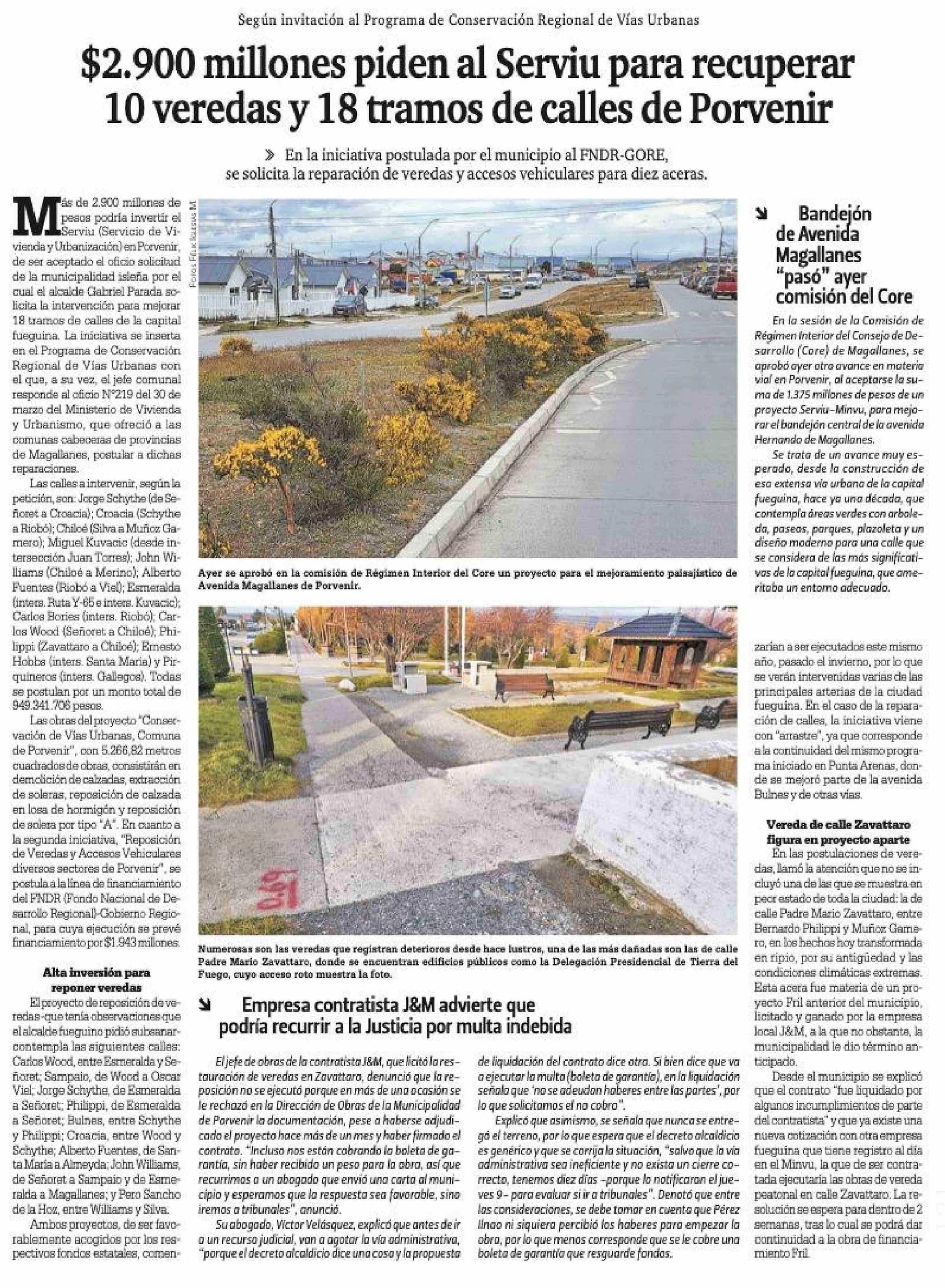 $2.900 Millones piden al Serviu para recuperar 10 veredas y 18 tramos de calles de Porvenir