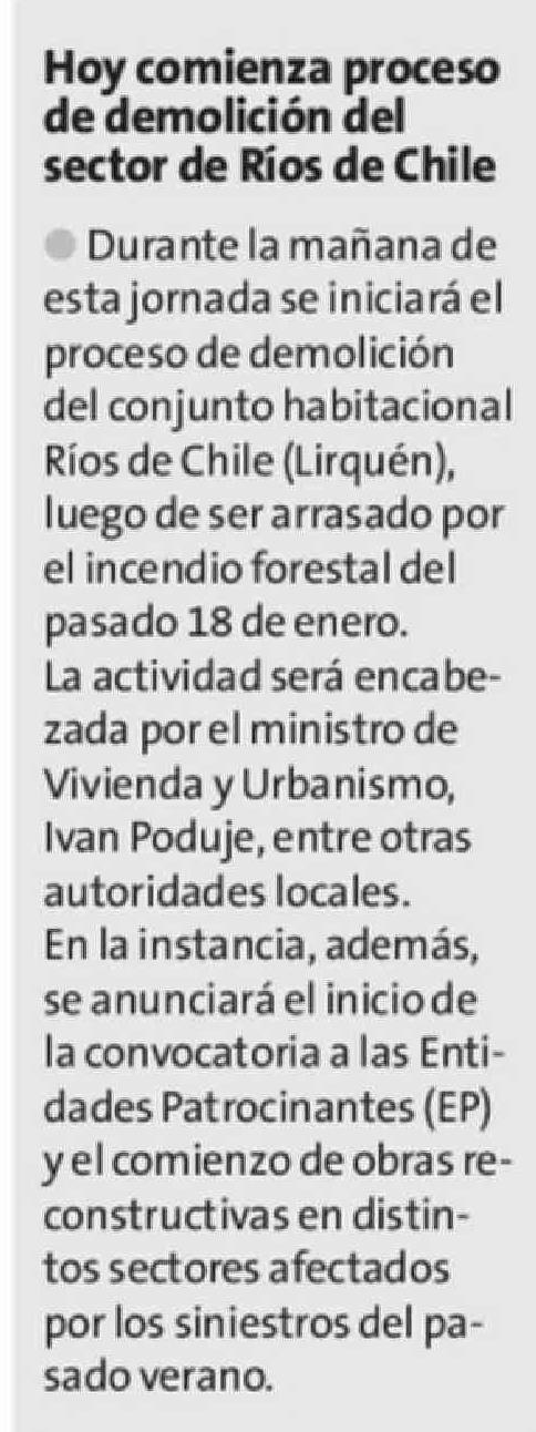 Título: Hoy comienza proceso de demolición del sector de Ríos de Chile · Durante la mañana de esta jornada se iniciará el proceso de demolición del conjunto habitacional Ríos de Chile (Lirquén), luego de ser arrasado por el incendio forestal del pasado 18 de enero. La actividad será encabezada por el minist