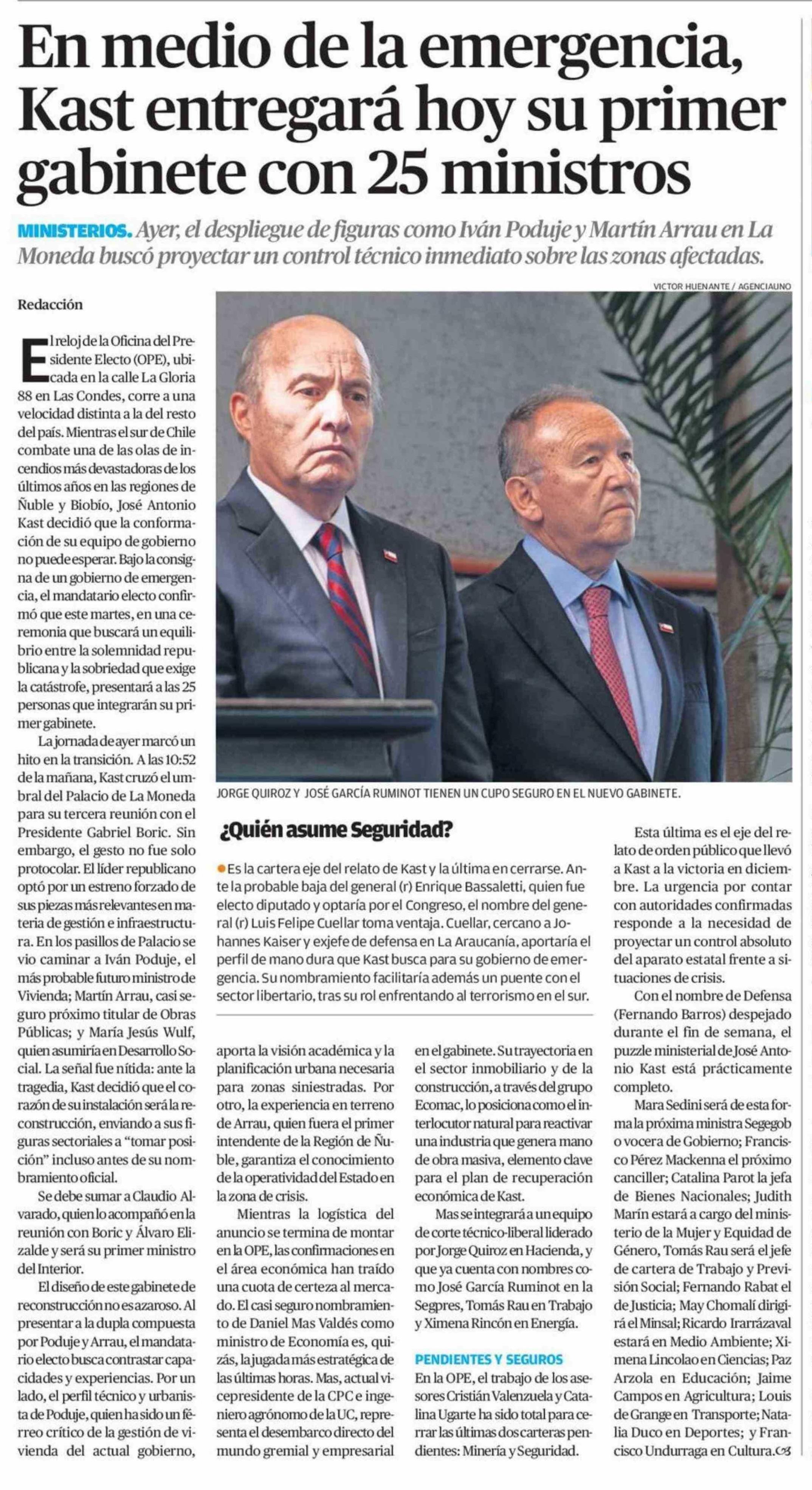 Título: En medio de la emergencia, Kast entregará hoy su primer gabinete con 25 ministros