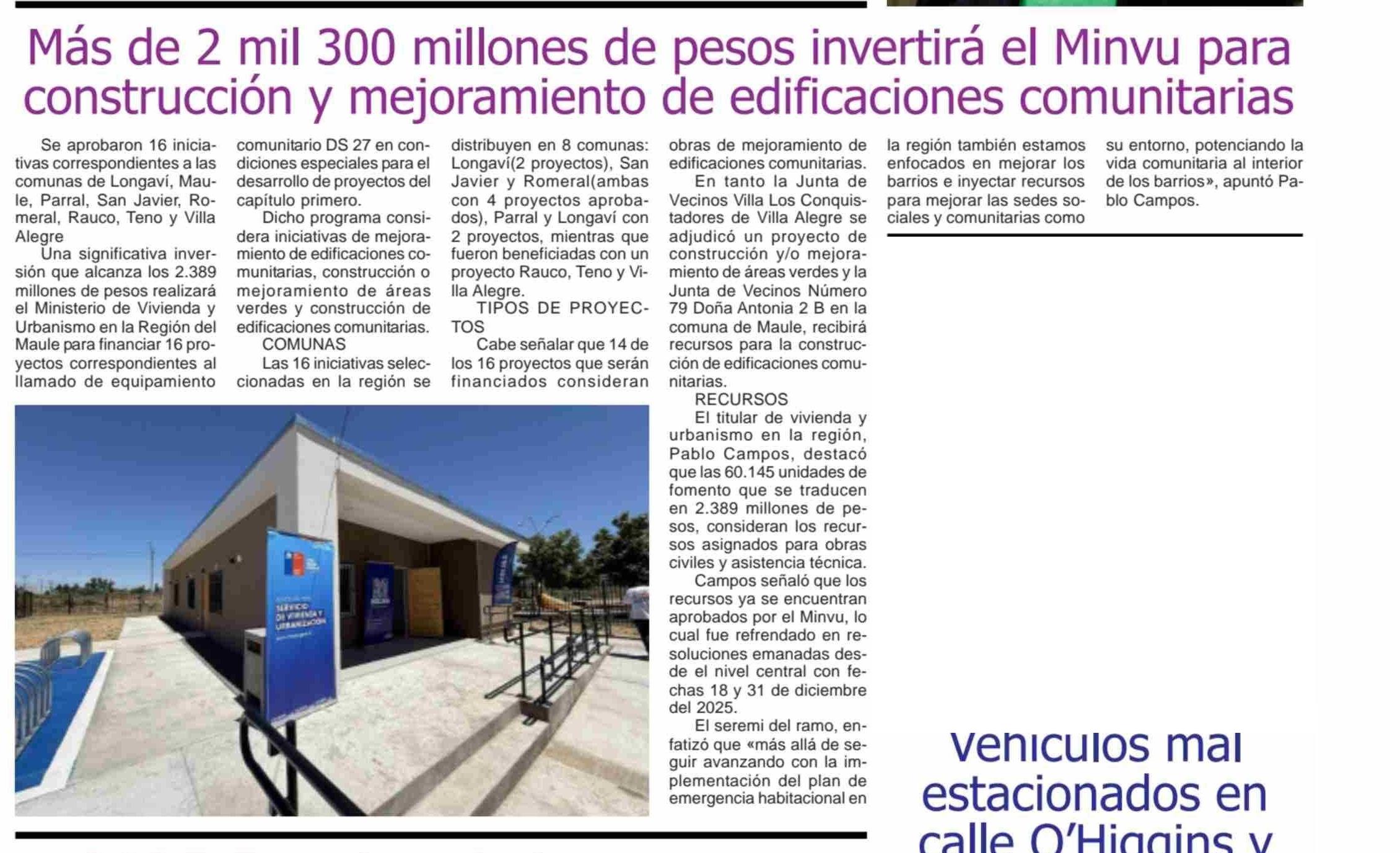 Más de 2 mil 300 millones de pesos ¡nvertirá el Minvu para construcción y mejoramiento de edificaciones comunitarias